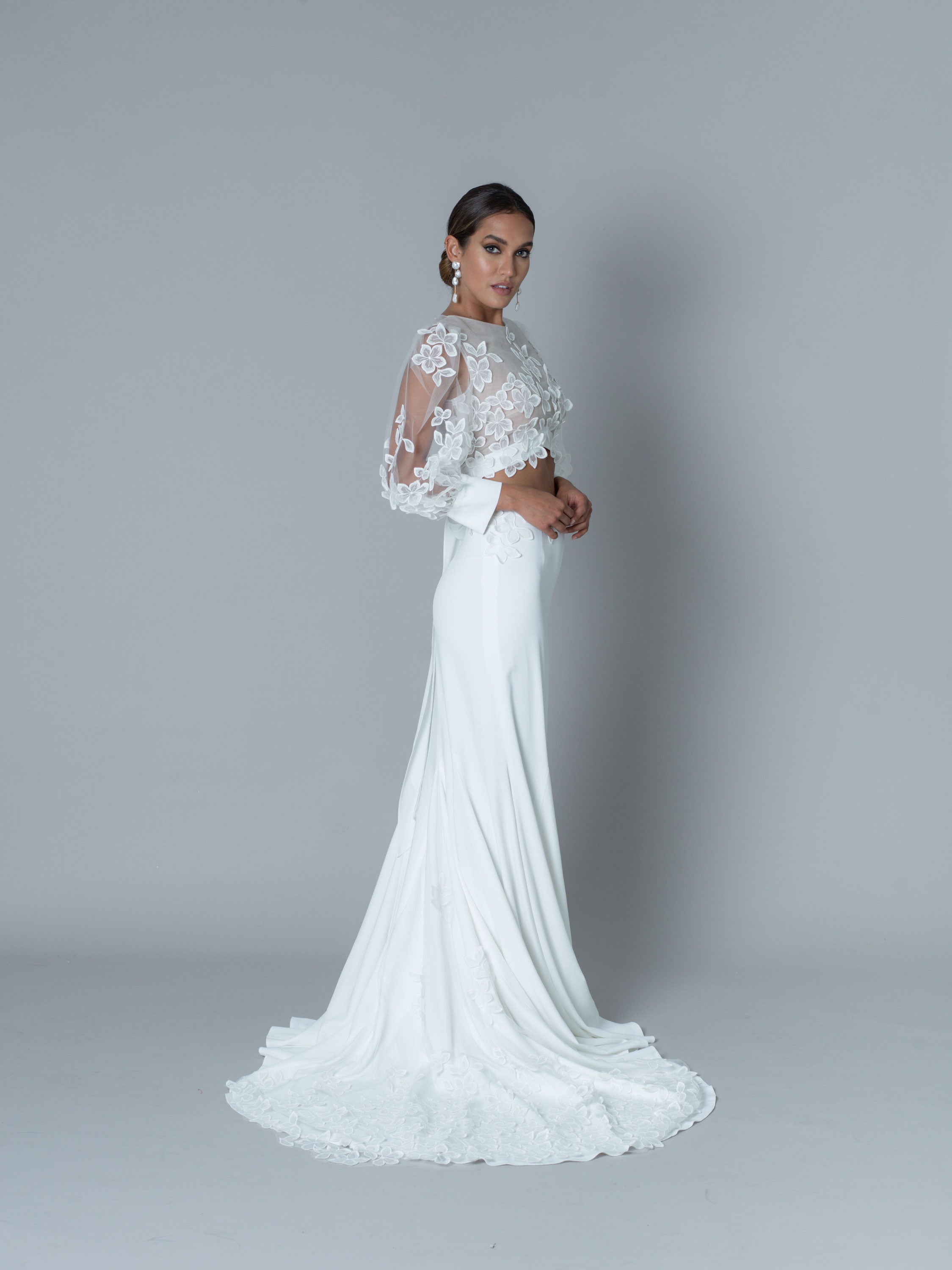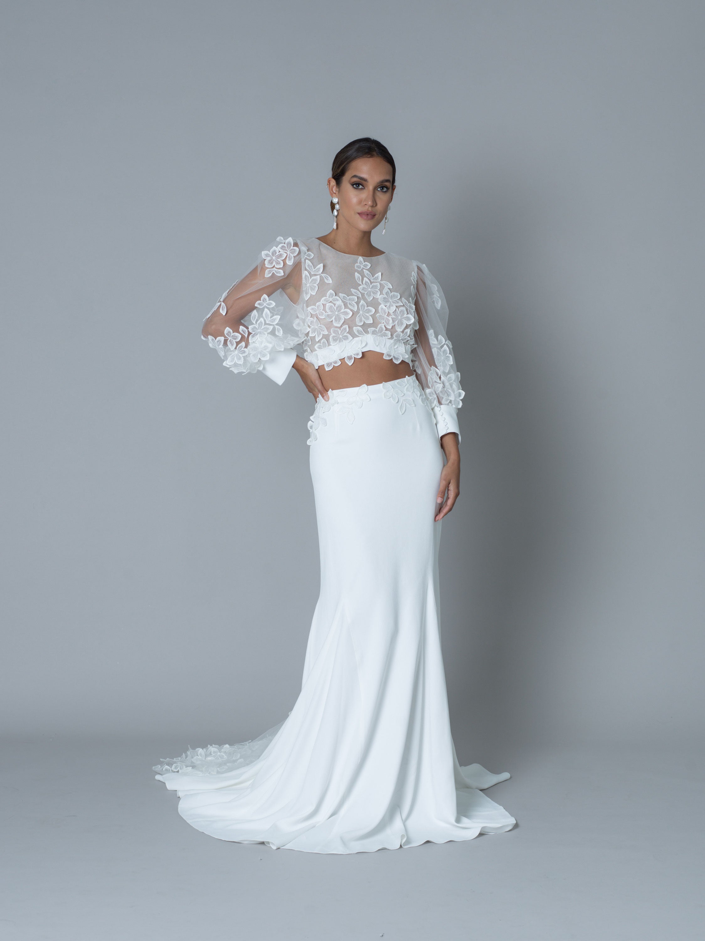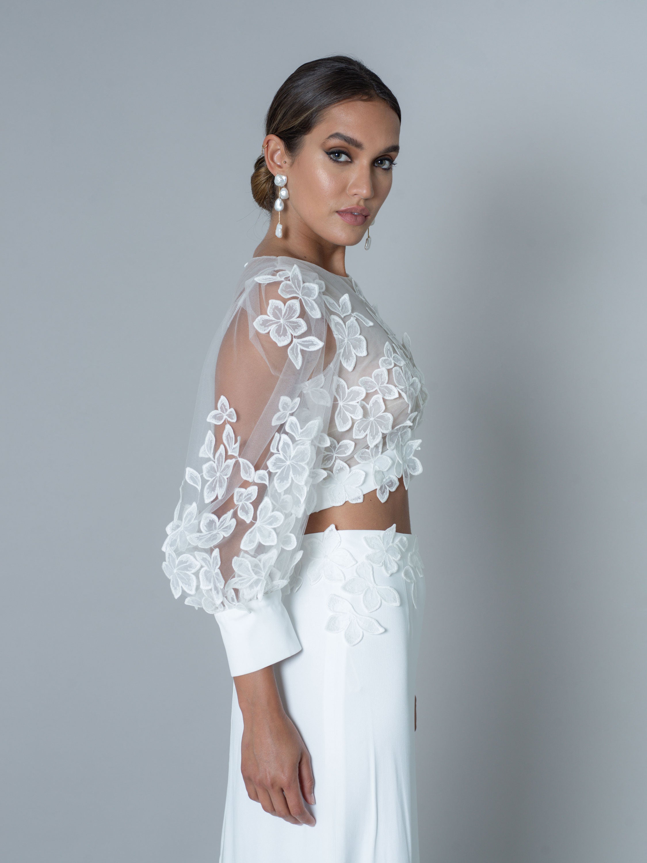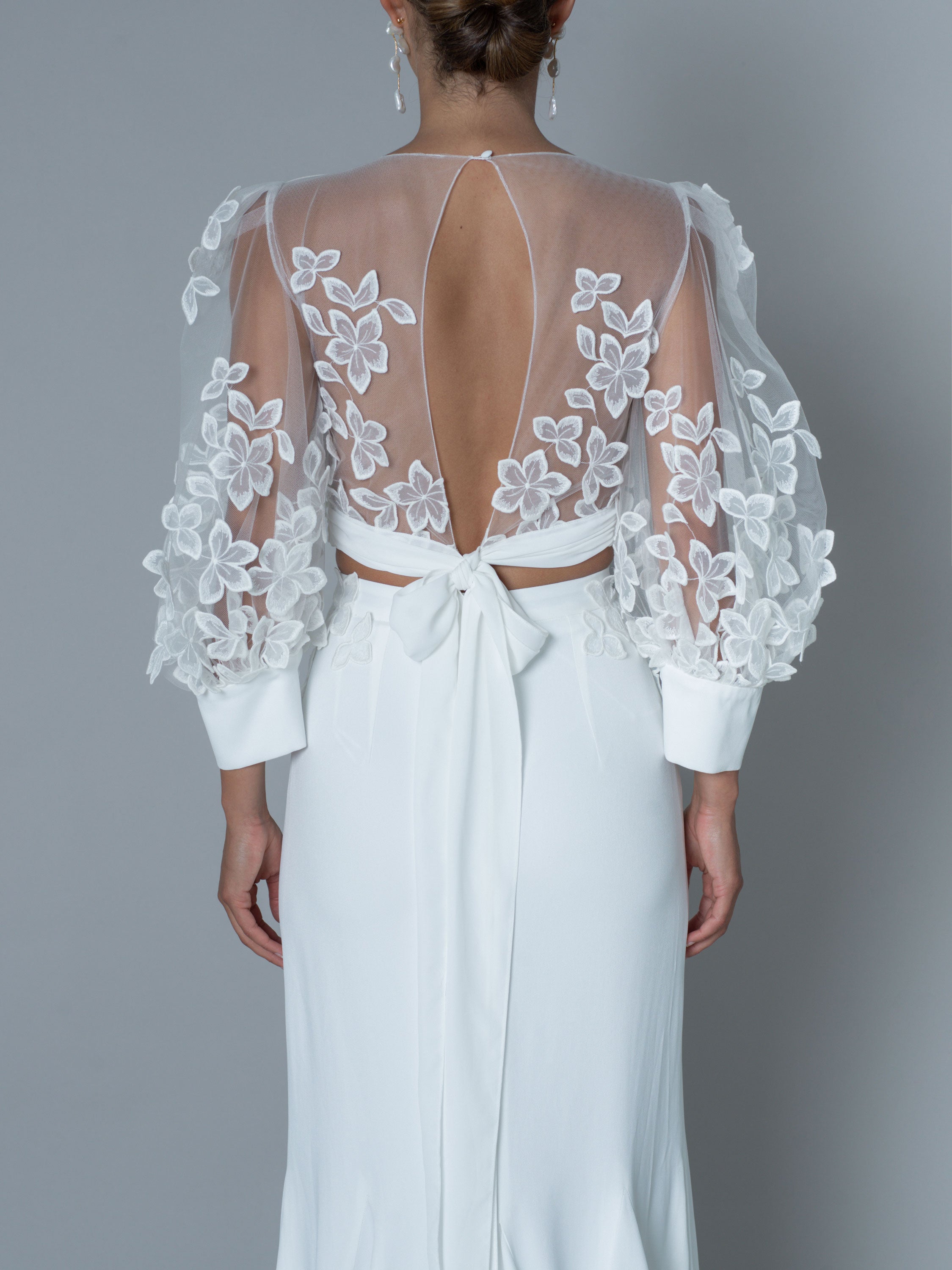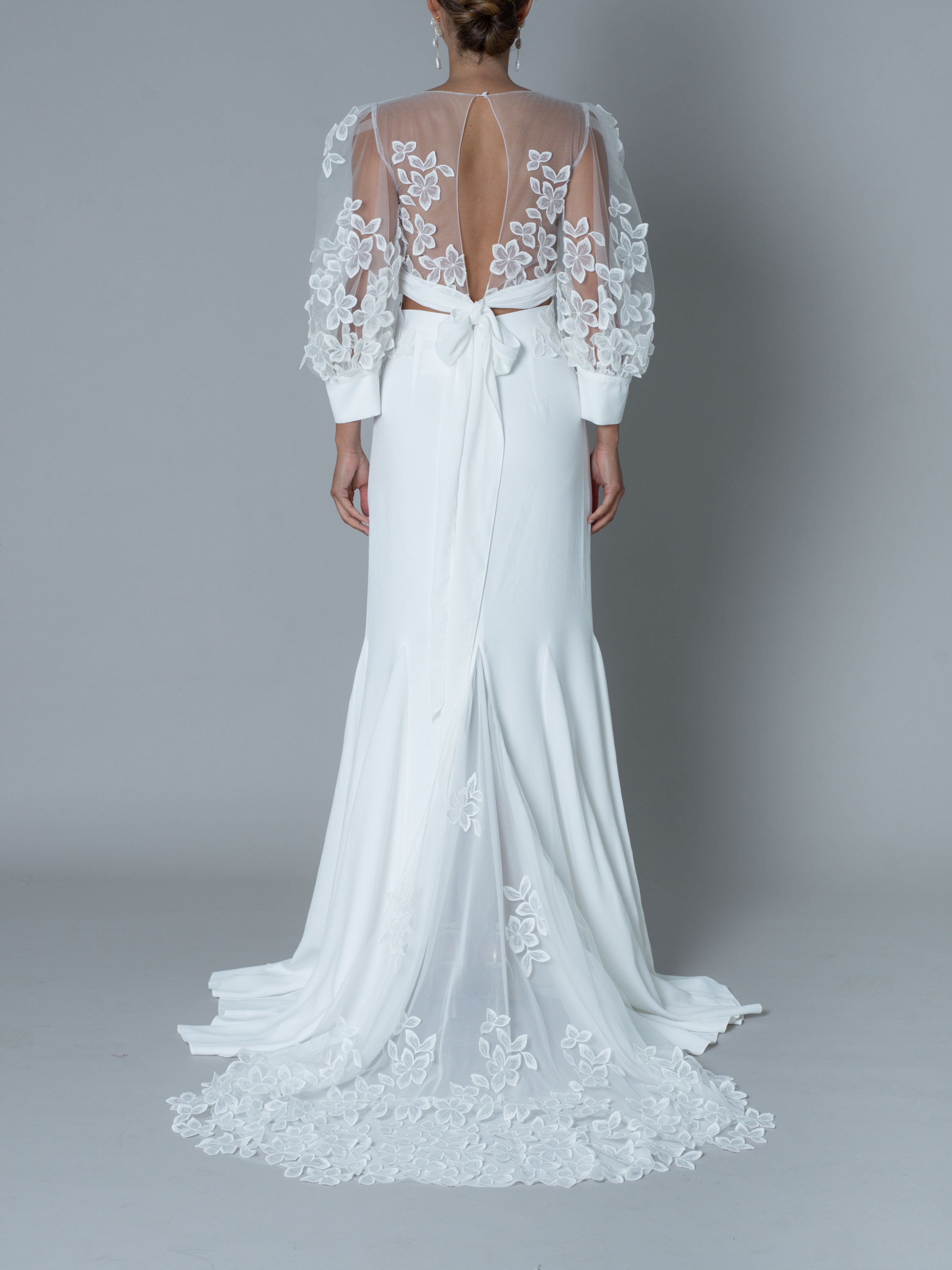 Ensemble deux pièces avec une ouverture entre le top et la jupe. Top à encolure arrondie orné de fleurs 3D posées à la main. Doublure couleur nude et découpe en chevron sous la poitrine en crêpe couture, soulignant la taille et la silhouette. Manches ballon en dentelle froncée, avec poignets en crêpe couture resserrés et boutonnières.