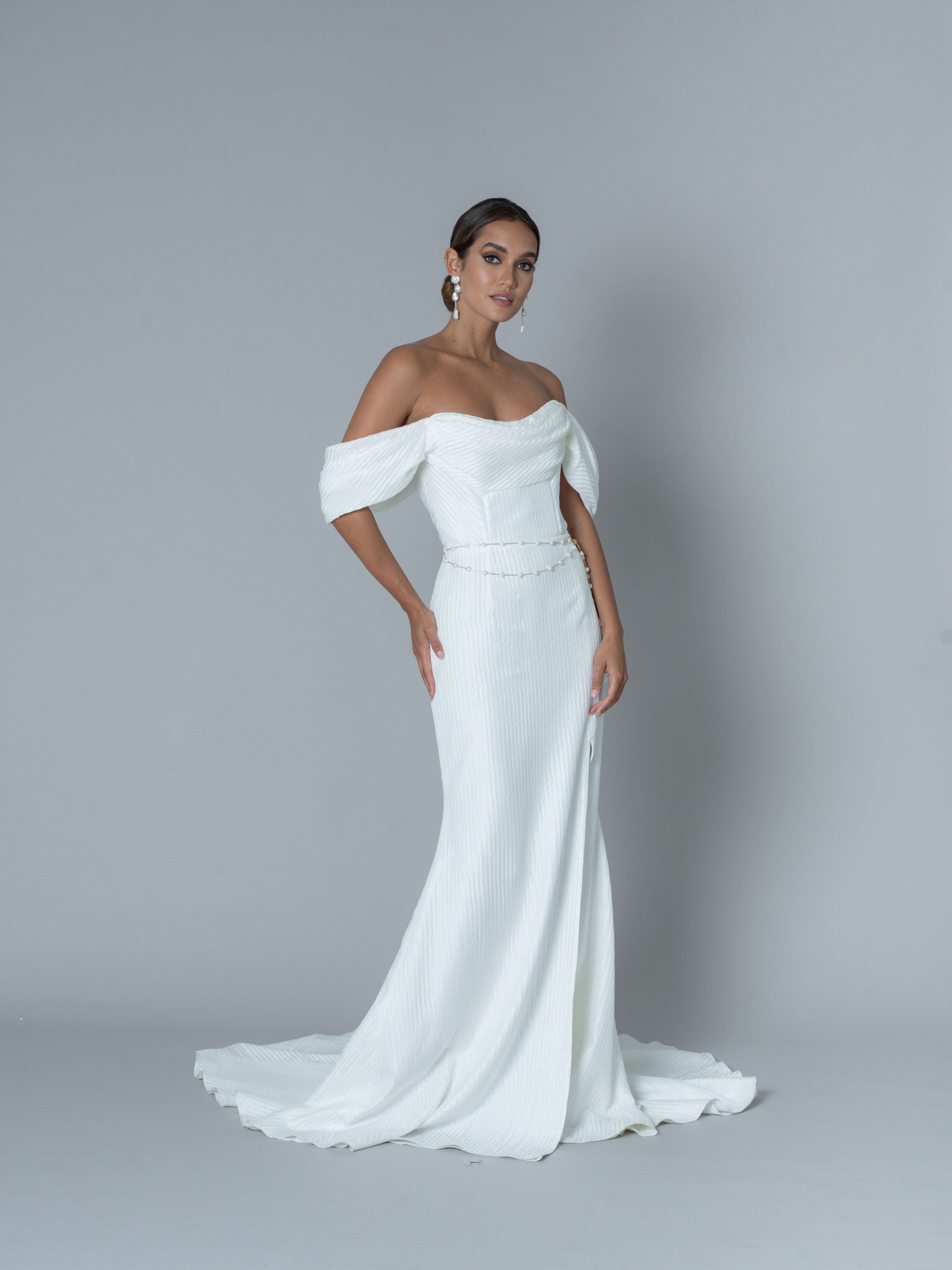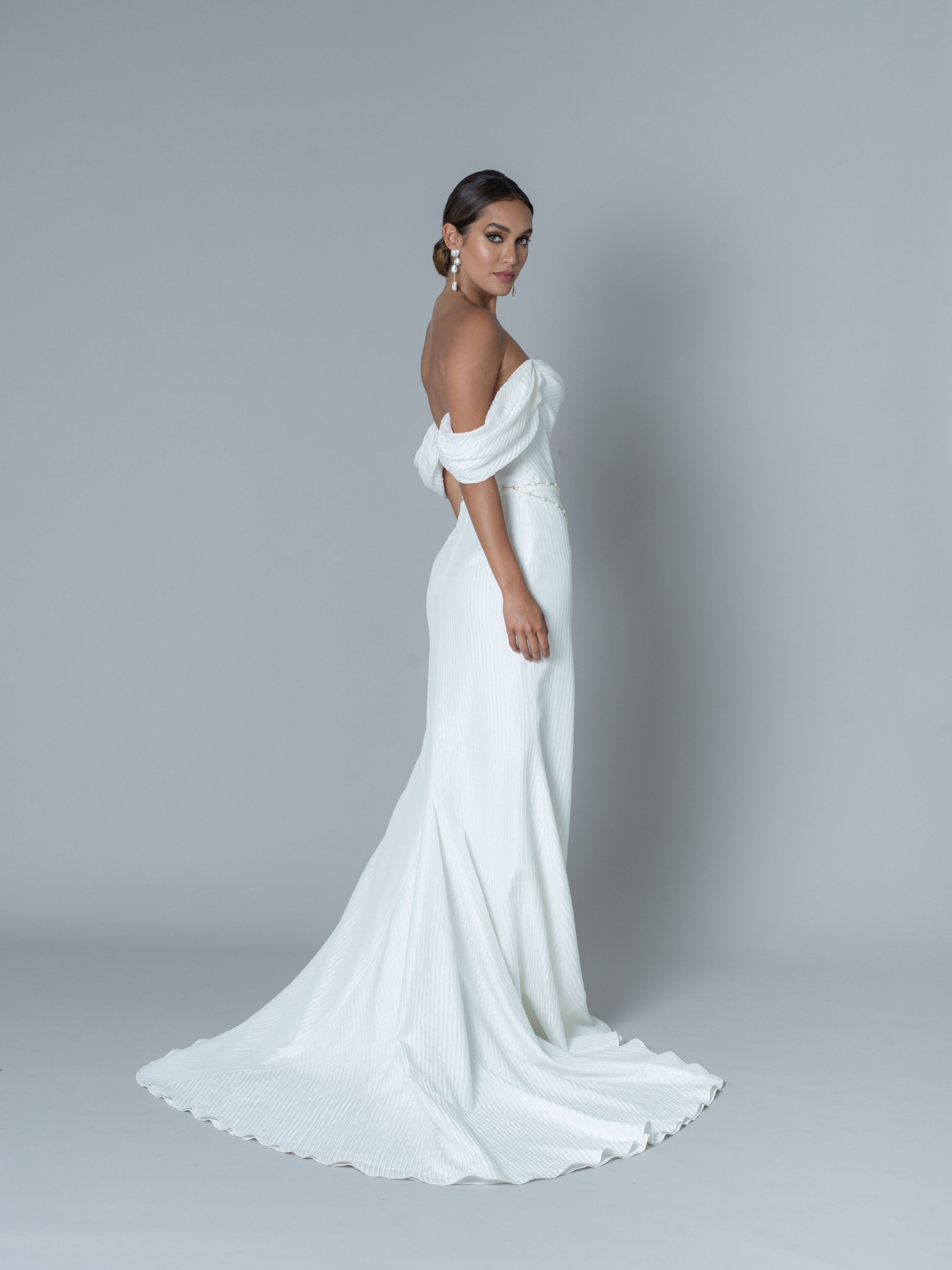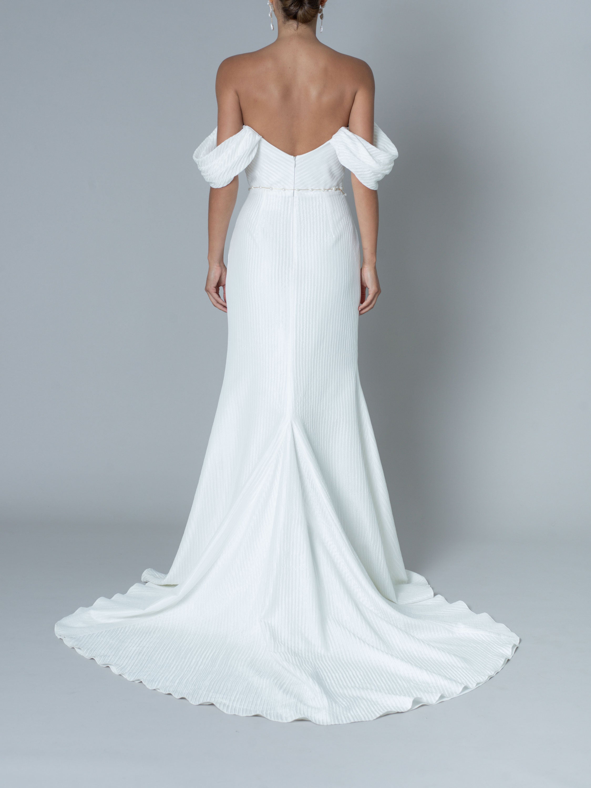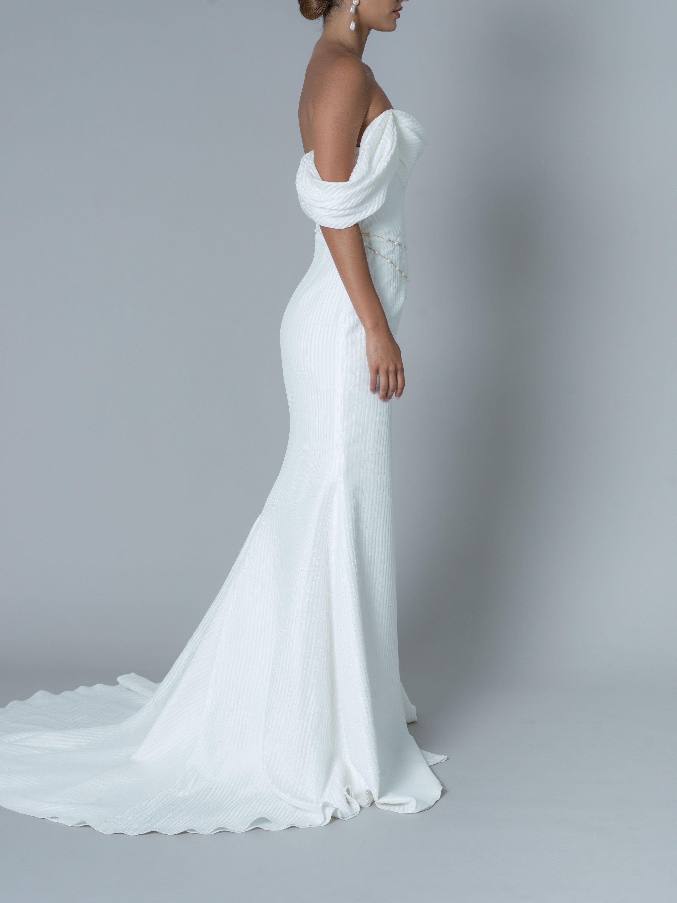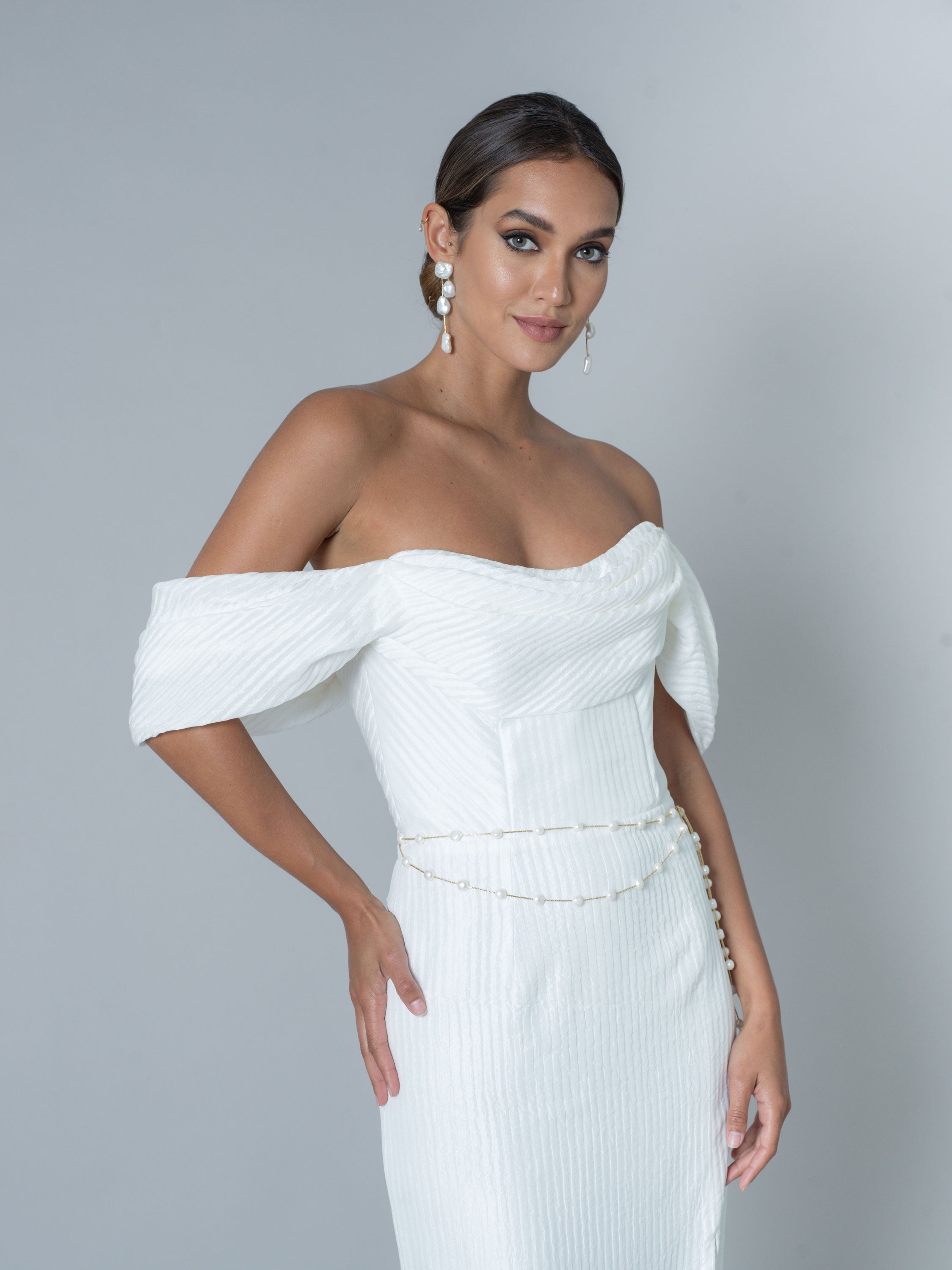 Robe bustier sans bretelles avec baleines, entièrement réalisée en tissu froissé qui crée un effet plissé. Bustier drapé sur la poitrine avec des manches tombantes.