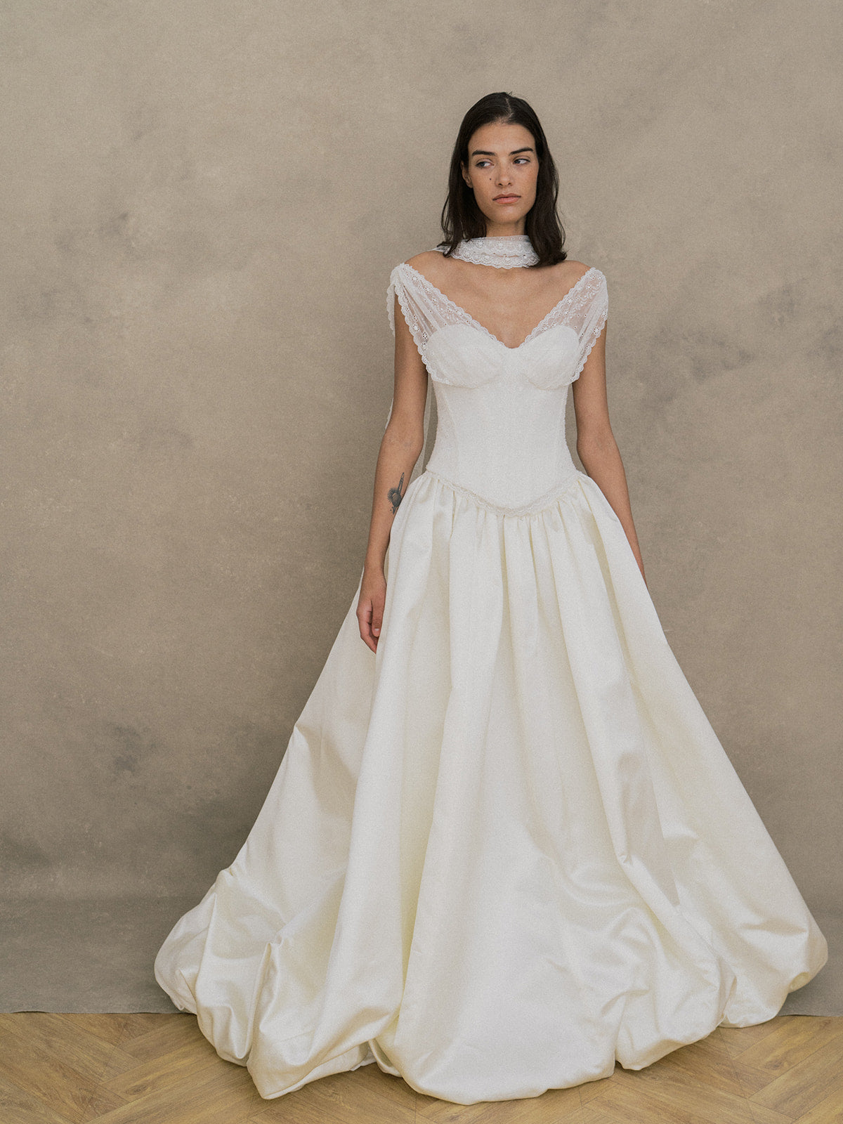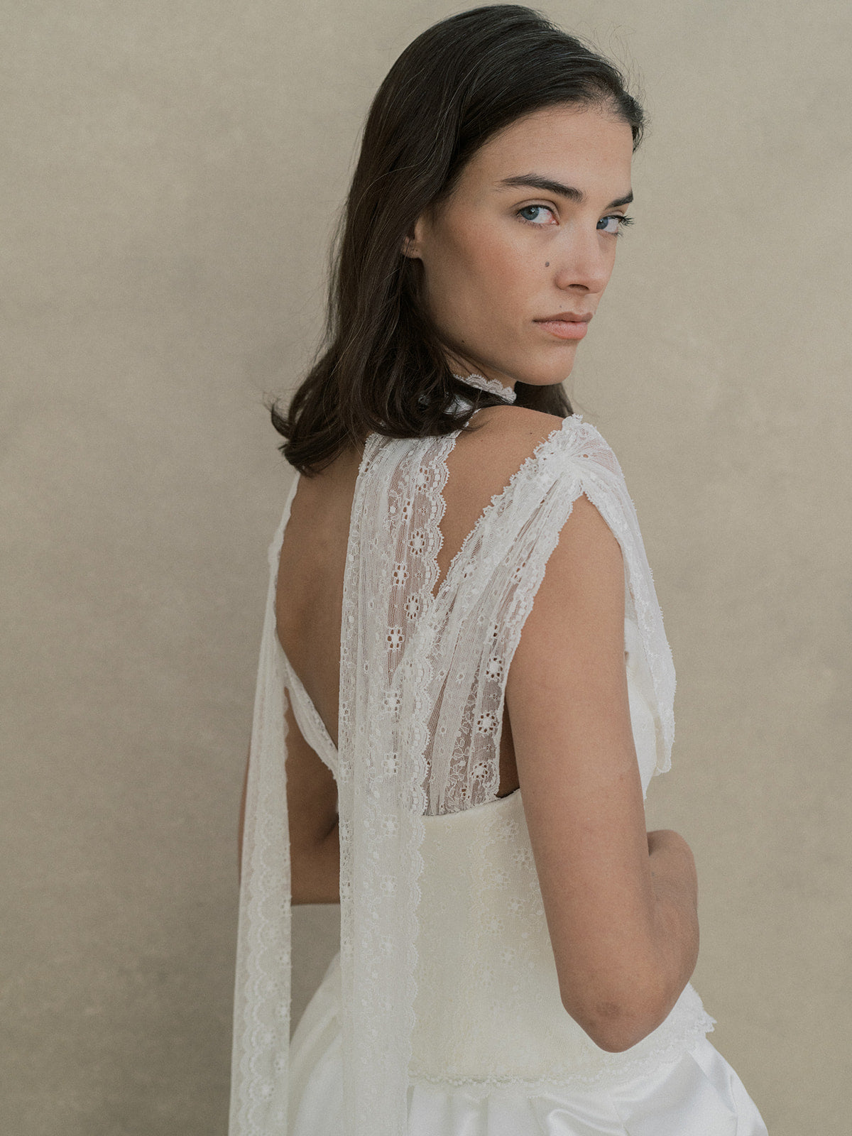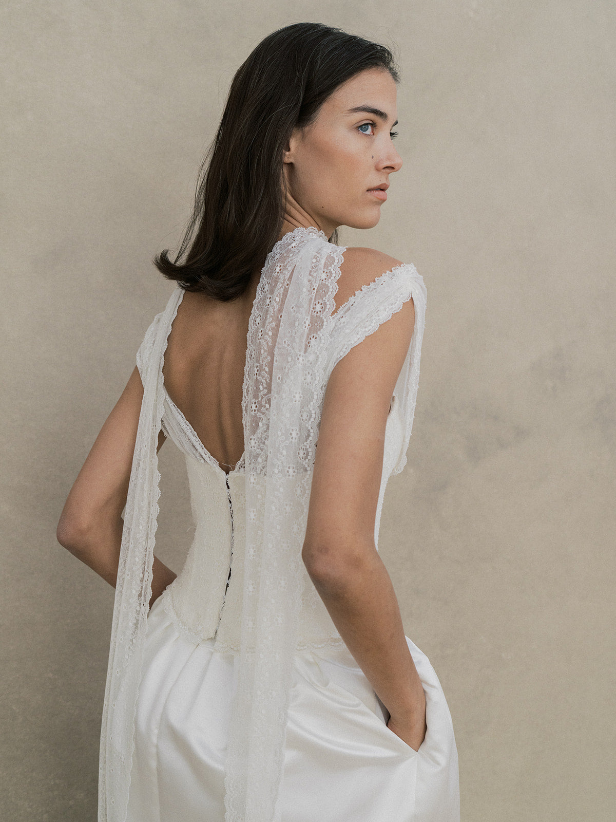 Ce modèle a été développé en exclusivité en collaboration avec la styliste mariage Kennedy Schmidt de Bisou Bride. Un ensemble raffiné composé d’un top et d’une jupe. Le top bustier à coques est structuré avec une doublure et des baleines pour un maintien parfait. Il se ferme dans le dos par un système d’agrafes, rappelant un corset