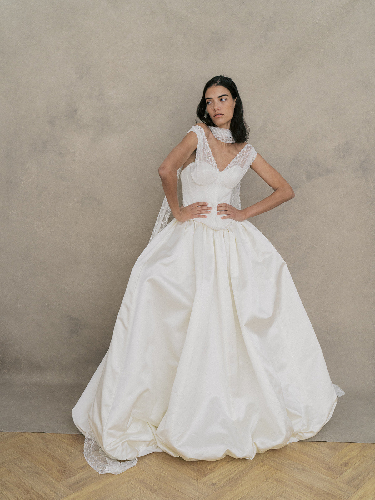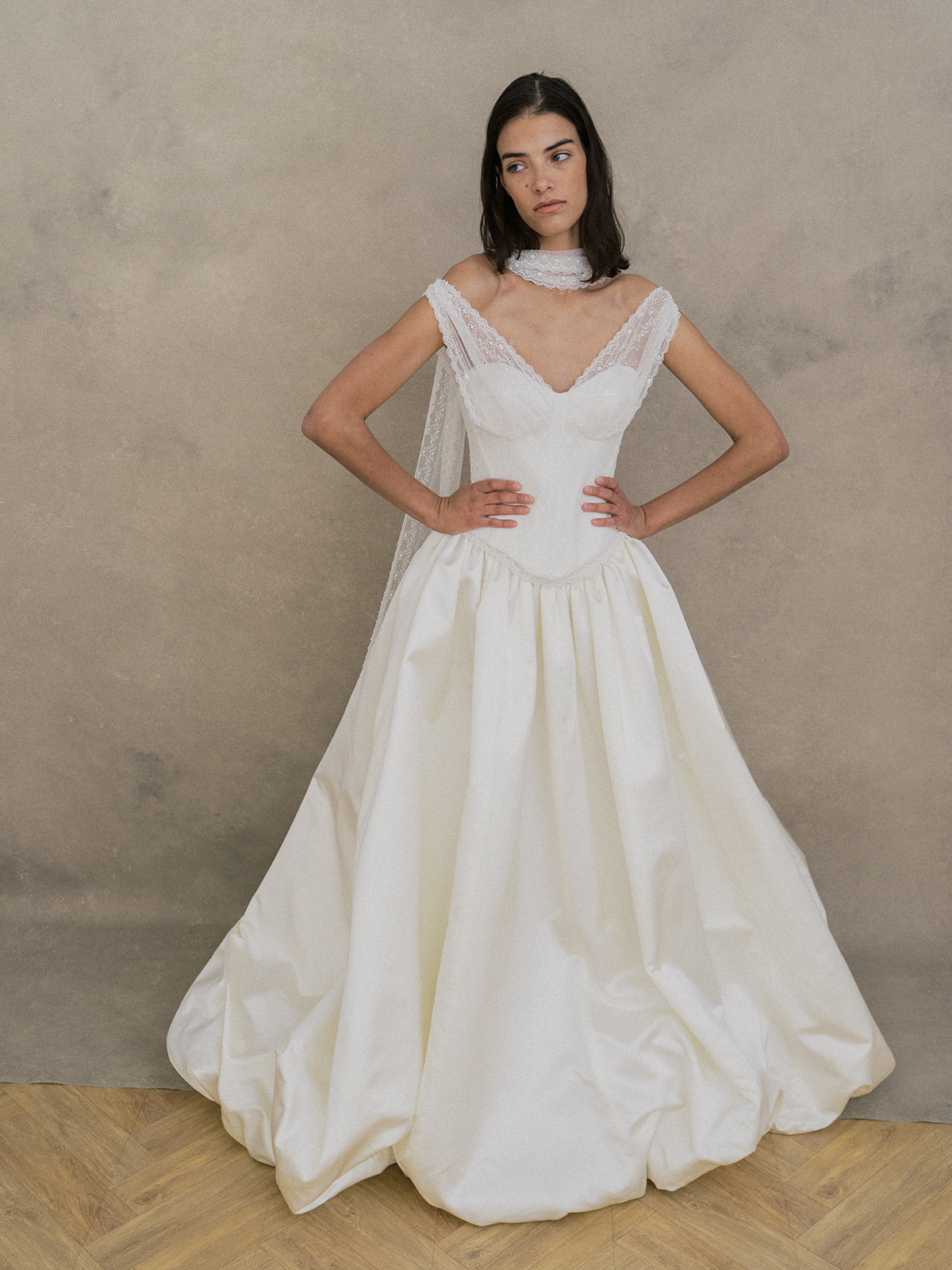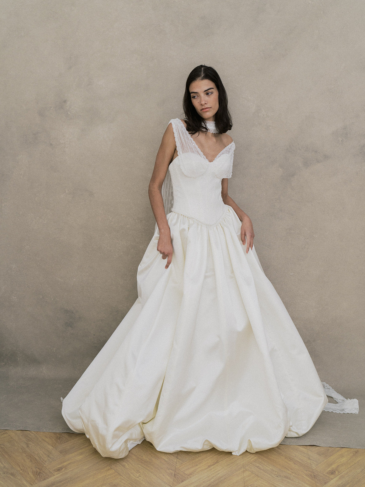Ce modèle a été développé en exclusivité en collaboration avec la styliste mariage Kennedy Schmidt de Bisou Bride. Un ensemble raffiné composé d’un top et d’une jupe. Le top bustier à coques est structuré avec une doublure et des baleines pour un maintien parfait. Il se ferme dans le dos par un système d’agrafes, rappelant un corset