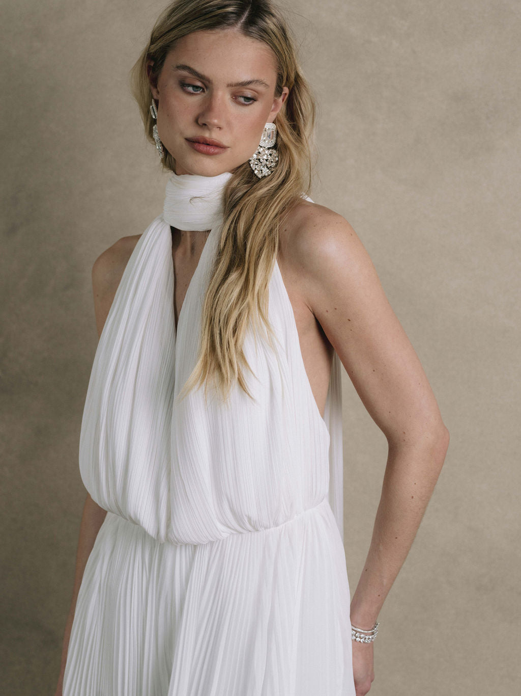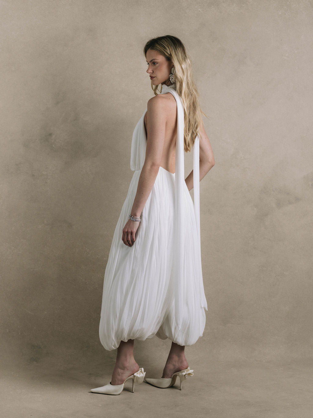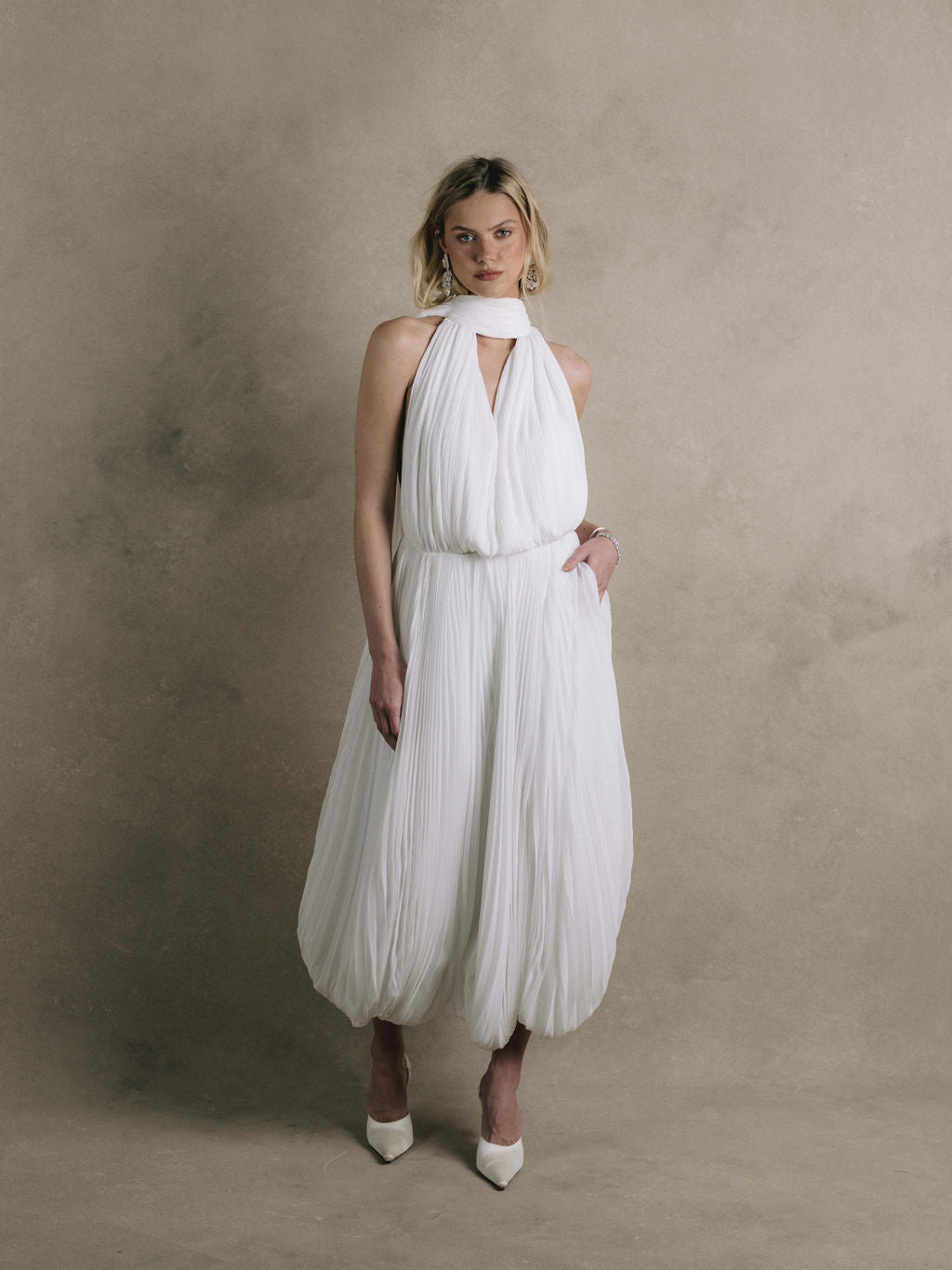 Le col plissé se ferme par de petits boutons et se pare d’un foulard cousu qui retombe avec grâce sur le dos nu, apportant une touche de sophistication.