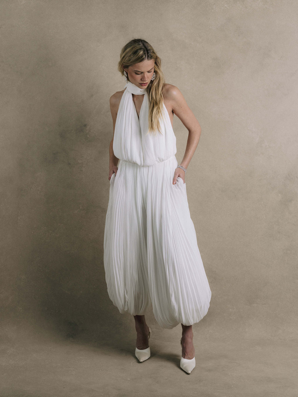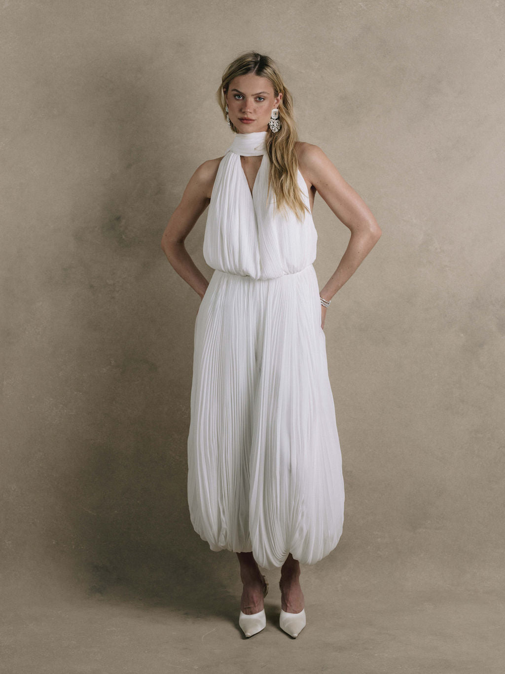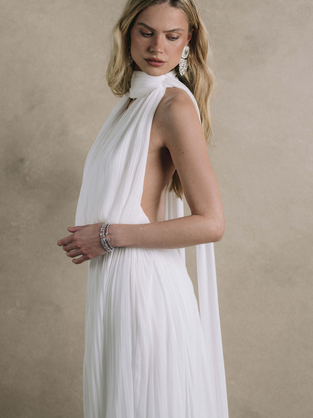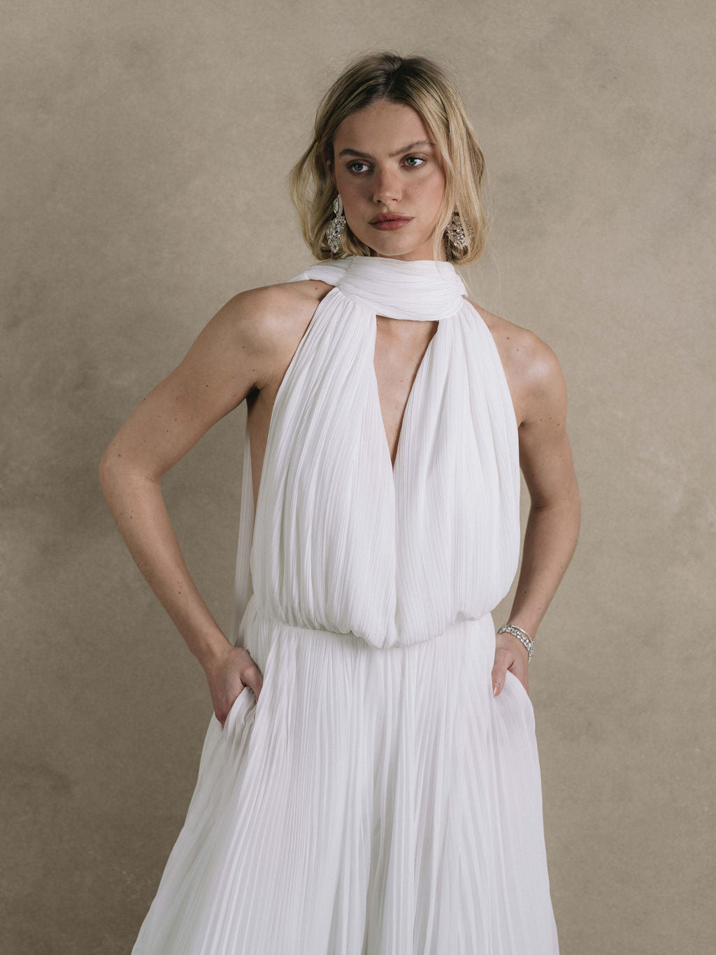 Le col plissé se ferme par de petits boutons et se pare d’un foulard cousu qui retombe avec grâce sur le dos nu, apportant une touche de sophistication.