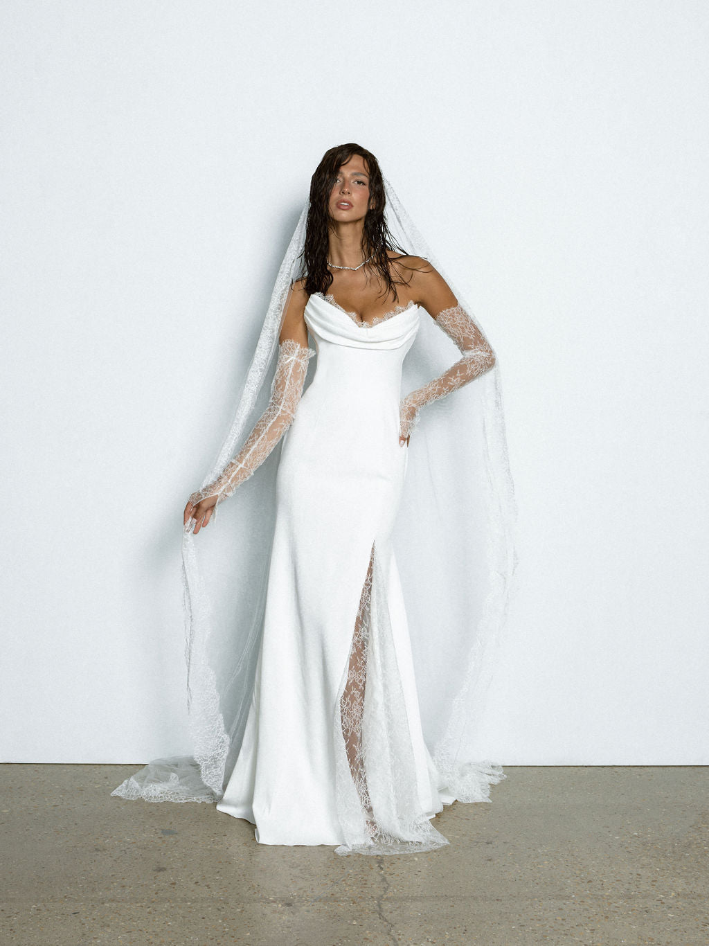 Divine incarne une beauté angélique et une grâce intemporelle. La dentelle de Chantilly ajoute une touche de romantisme, mise en valeur par le bustier drapé.