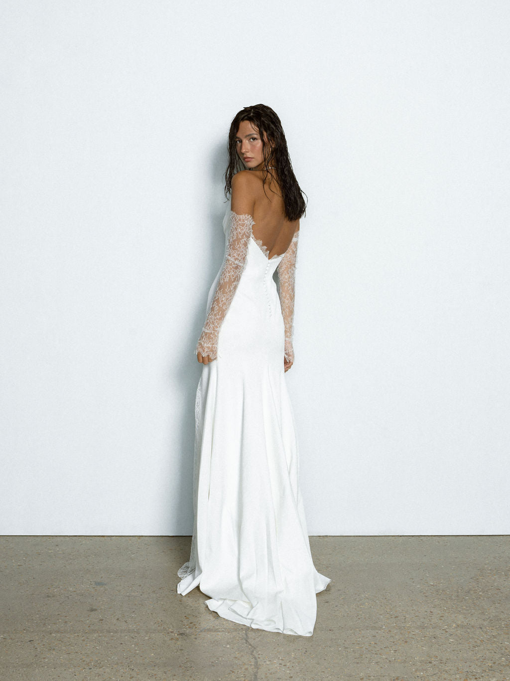 Robe bustier sans bretelles en crêpe couture avec baleines, drapée de manière asymétrique à l’avant. Le décolleté est orné d’un galon de dentelle florale de Chantilly. La robe présente une jupe sirène avec des découpes et une fente haute agrémentée d’une insertion en dentelle de Chantilly. Dos en V et traîne en crêpe.