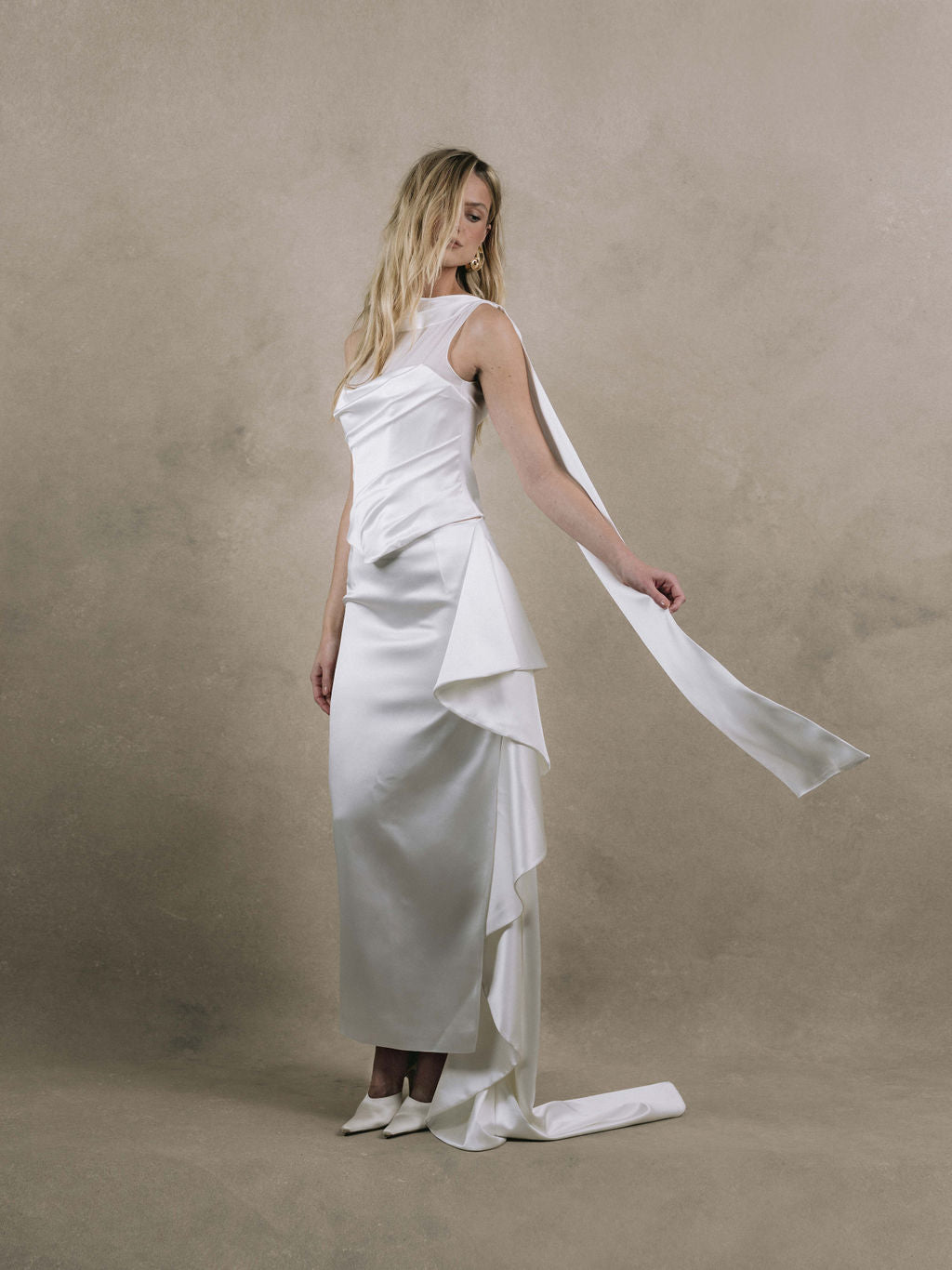Fabriqué sur commande avec un délai de production de 6 à 8 semaines. Bustier drapé en satin avec tissu gainant intégré et baleines pour une structure et un maintien optimaux. Un panneau en mousseline orne le devant du buste, tandis que l'encolure est sublimée par un foulard en satin. Le col se ferme à l’arrière par un bouton, formant une délicate goutte ouverte, tandis que le corset se ferme par des agrafes.