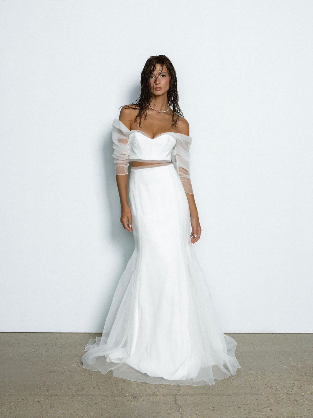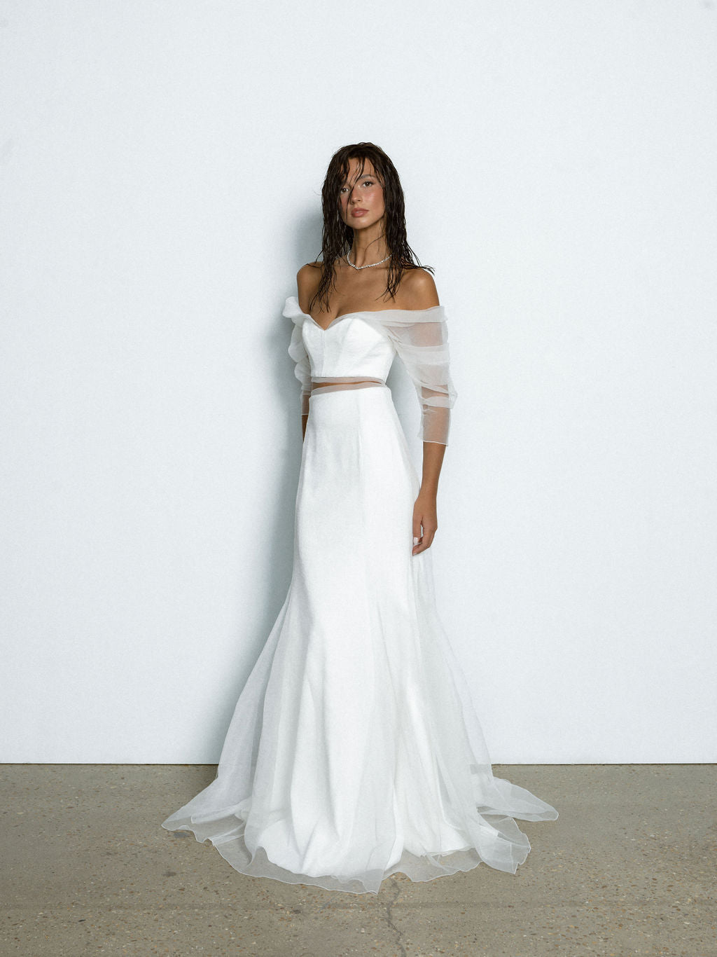 Jupe sirène taille haute en crêpe couture, recouverte d’une couche d’organza texturé descendant depuis la taille.