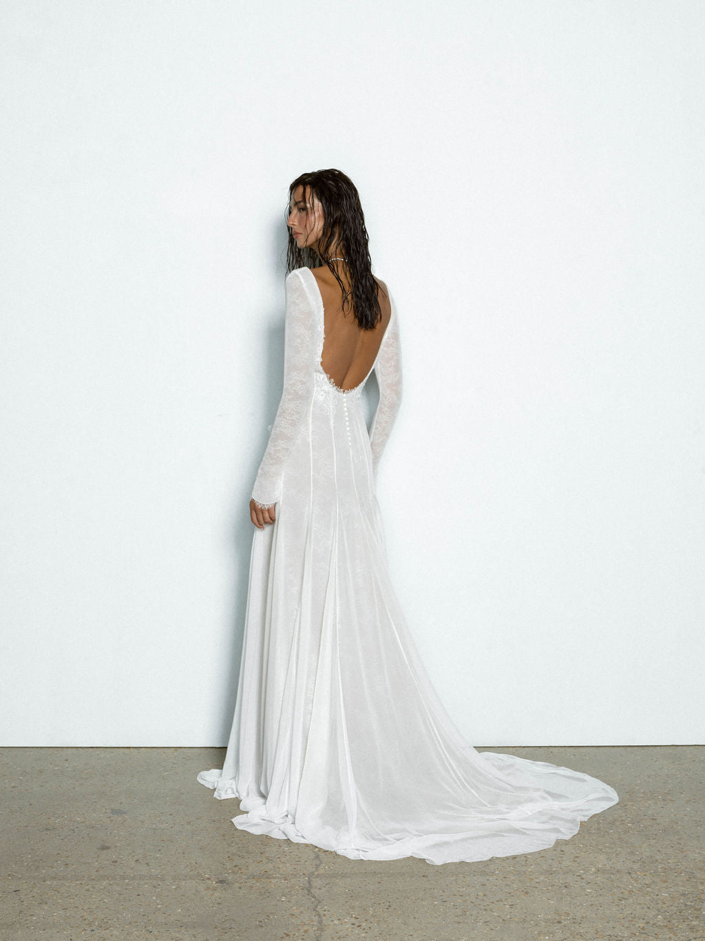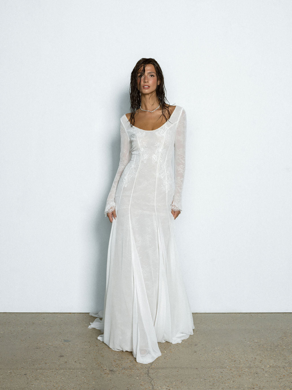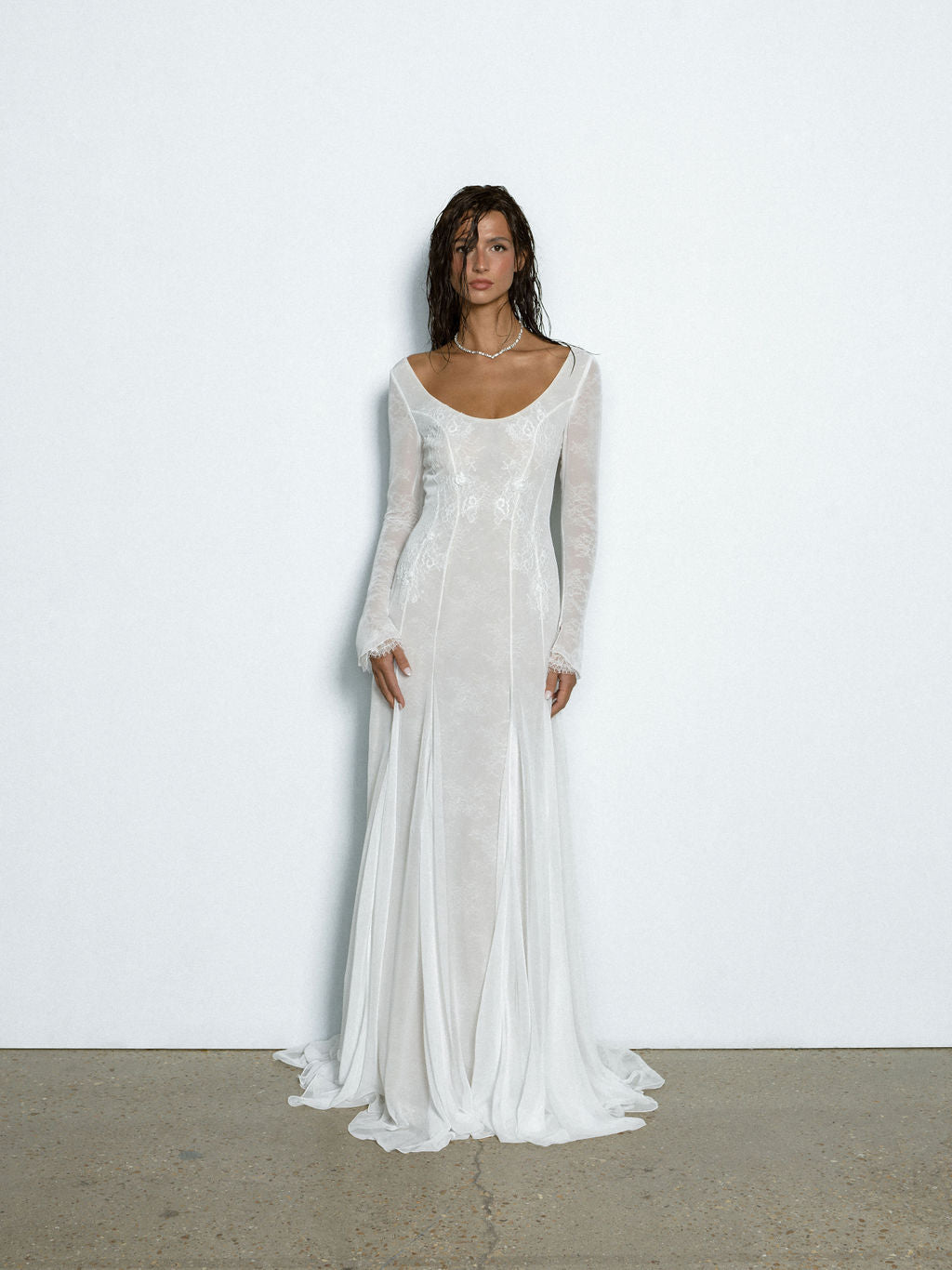 Robe sublime avec un décolleté en U à l’avant et un profond dos ballerine. Réalisée en tulle, dentelle de Chantilly et superpositions de chiffon. Des applications de dentelle de Chantilly sont brodées à la main sur l’ensemble de la robe.