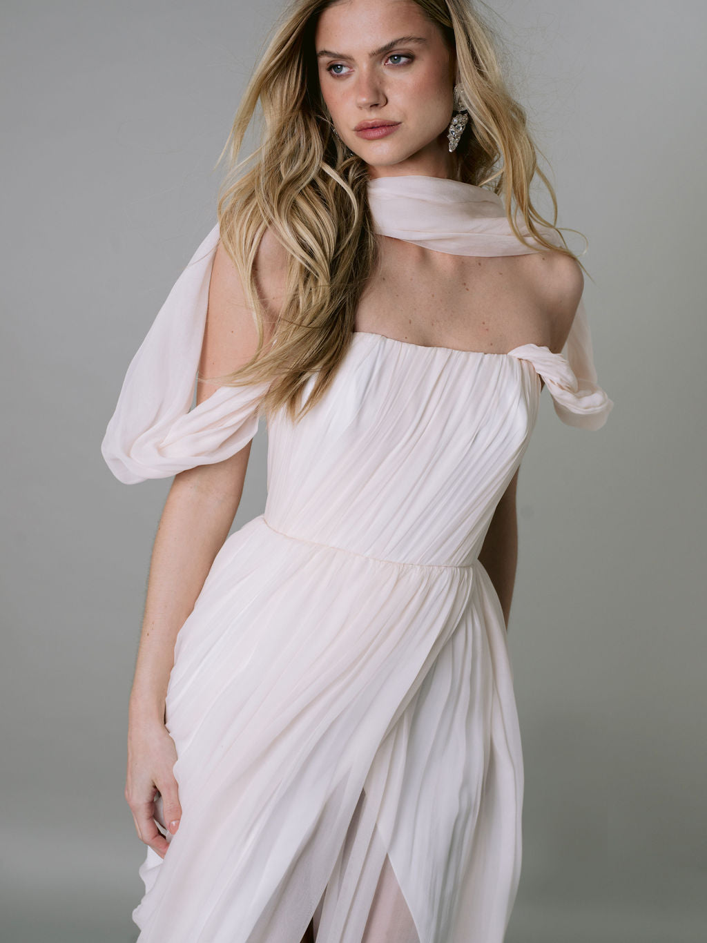 Un délicat drapé en chiffon rose pâle, entièrement réalisé à la main, enveloppe la robe d’une élégance légère et aérienne.