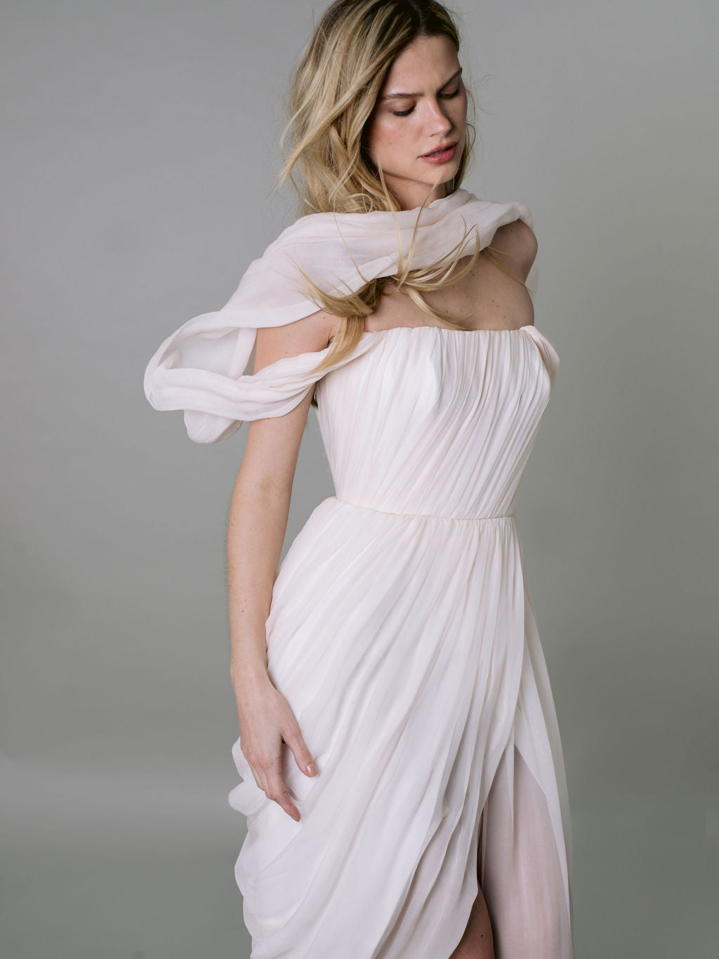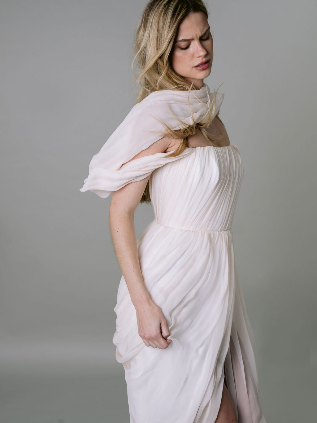 La jupe asymétrique, drapée sur le devant, sublime la silhouette, tandis que le dos se ferme discrètement par une fermeture éclair.