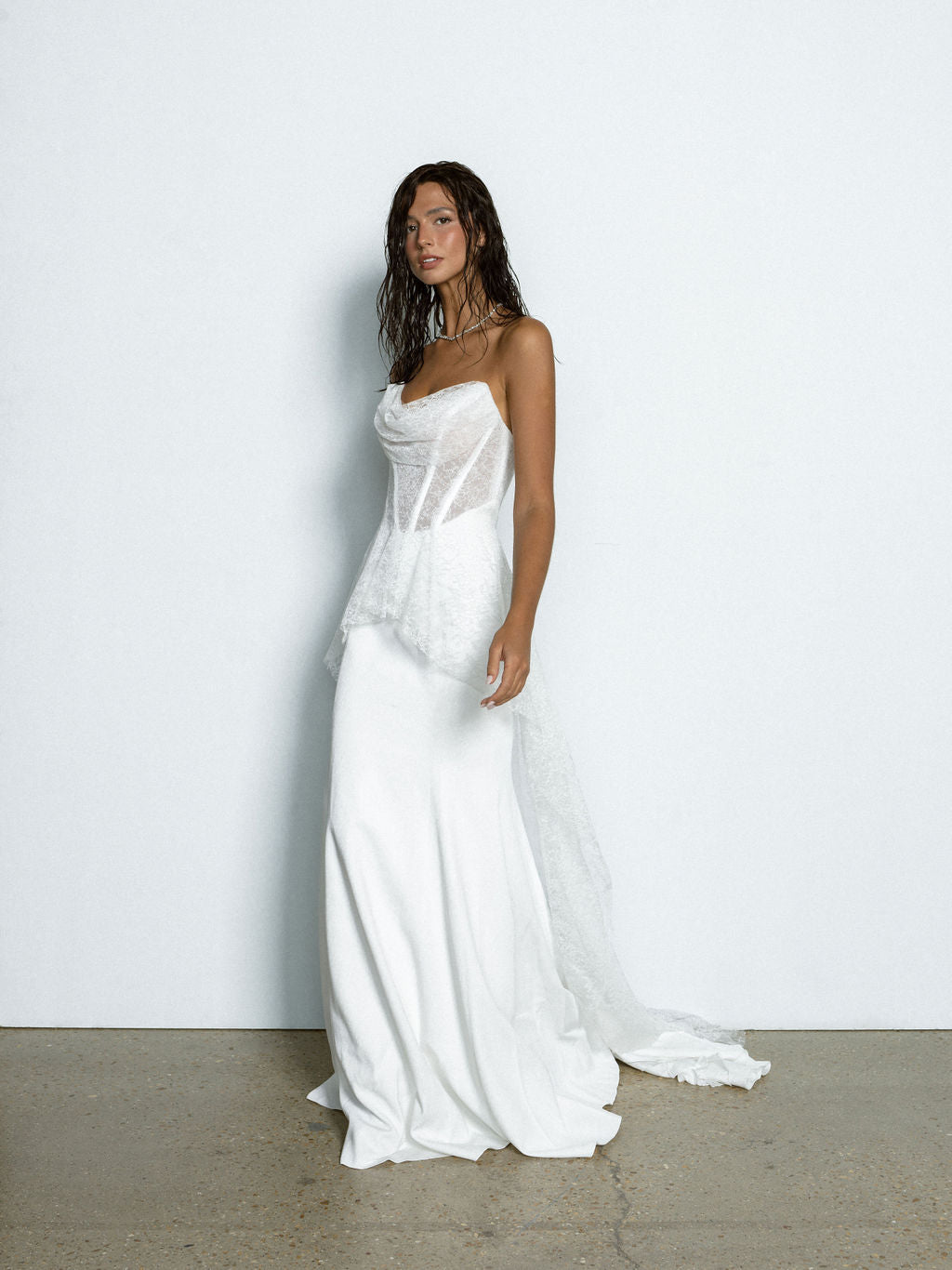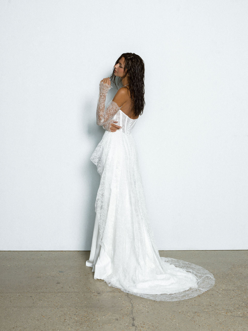 Robe bustier sans bretelles en dentelle de Chantilly avec baleines visibles et drapé bénitier. Les gants sont vendus séparément.