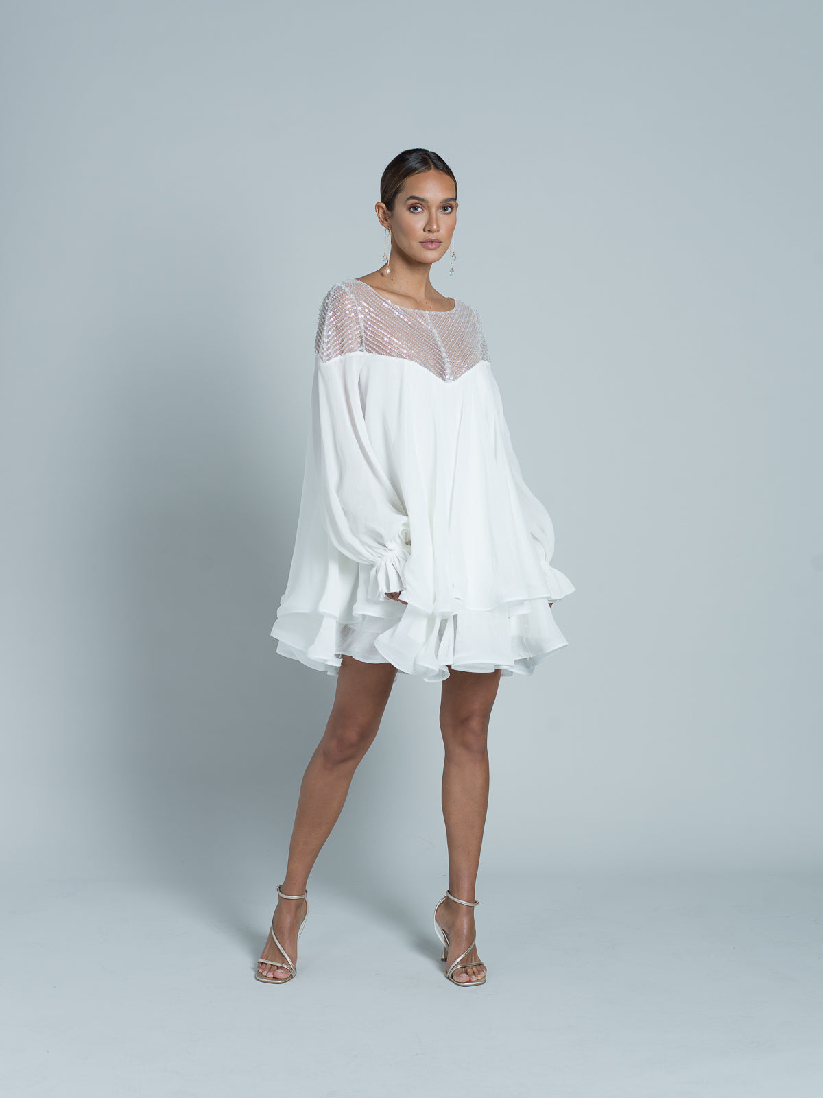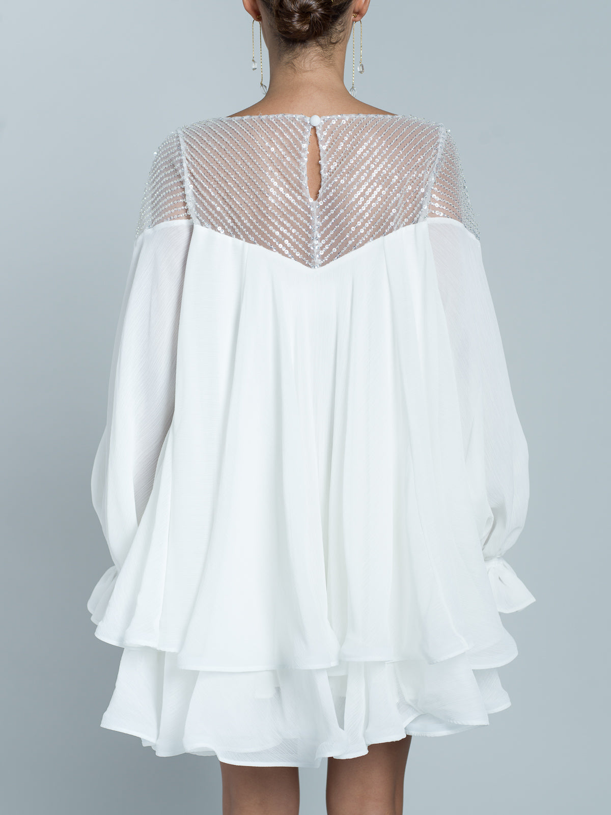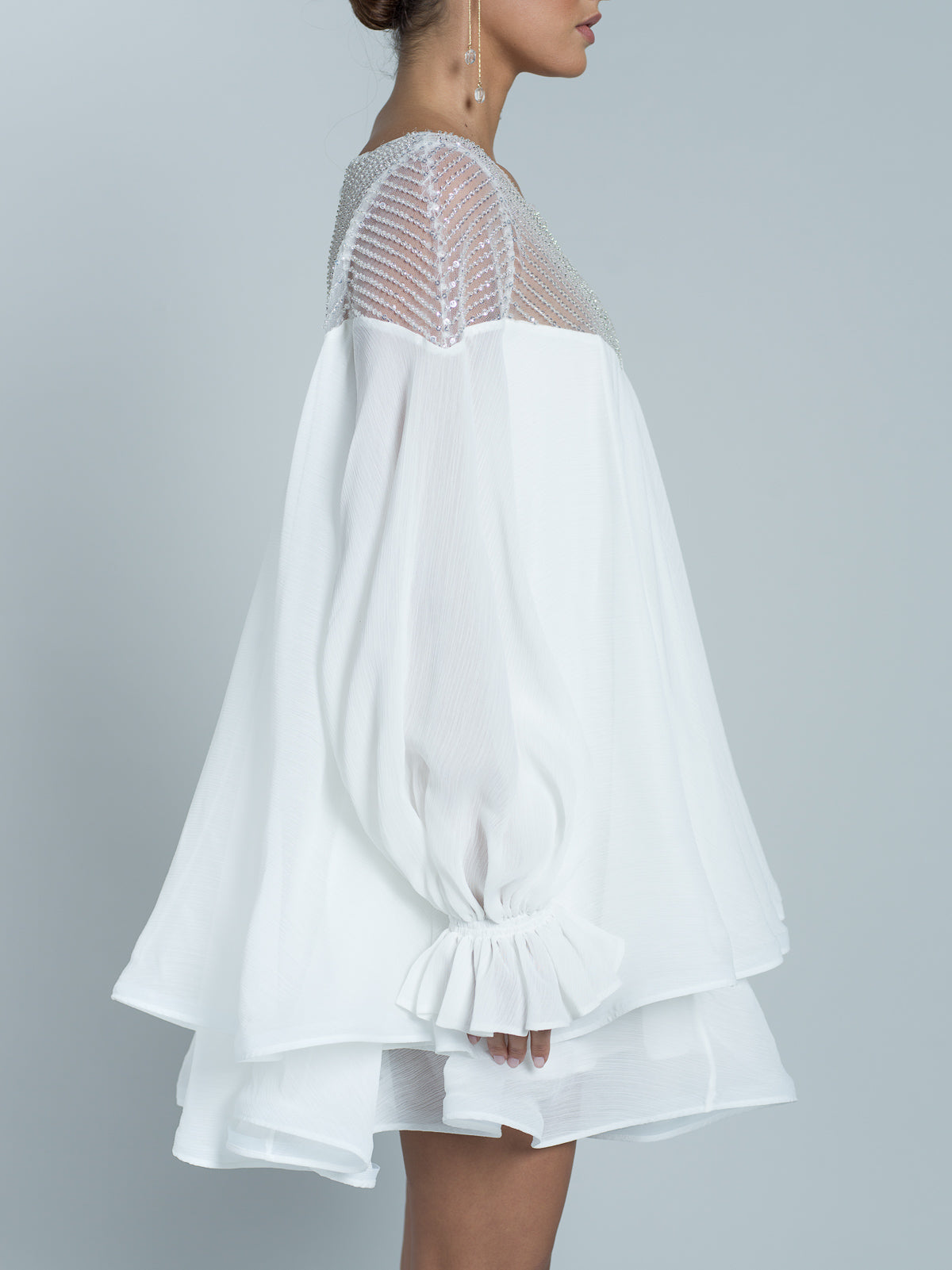 Robe courte à manches longues entièrement réalisée en mousseline. Encolure en forme de cœur, agrémentée d'un tulle brodé de paillettes scintillantes et de perles transparentes. Manches fluides avec élastiques aux poignets. Des bandes de crin sont placées au bord des volants de la jupe pour donner de la structure et un effet ondulé.