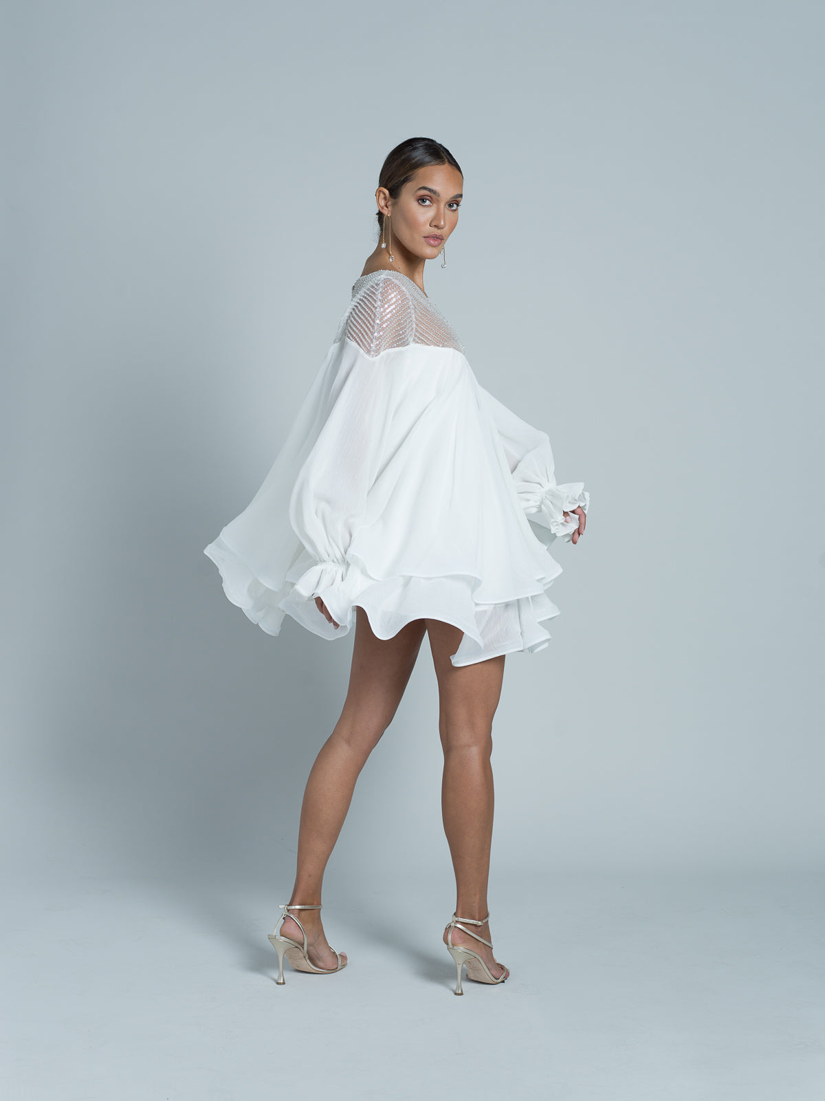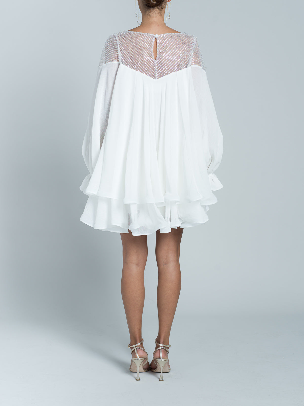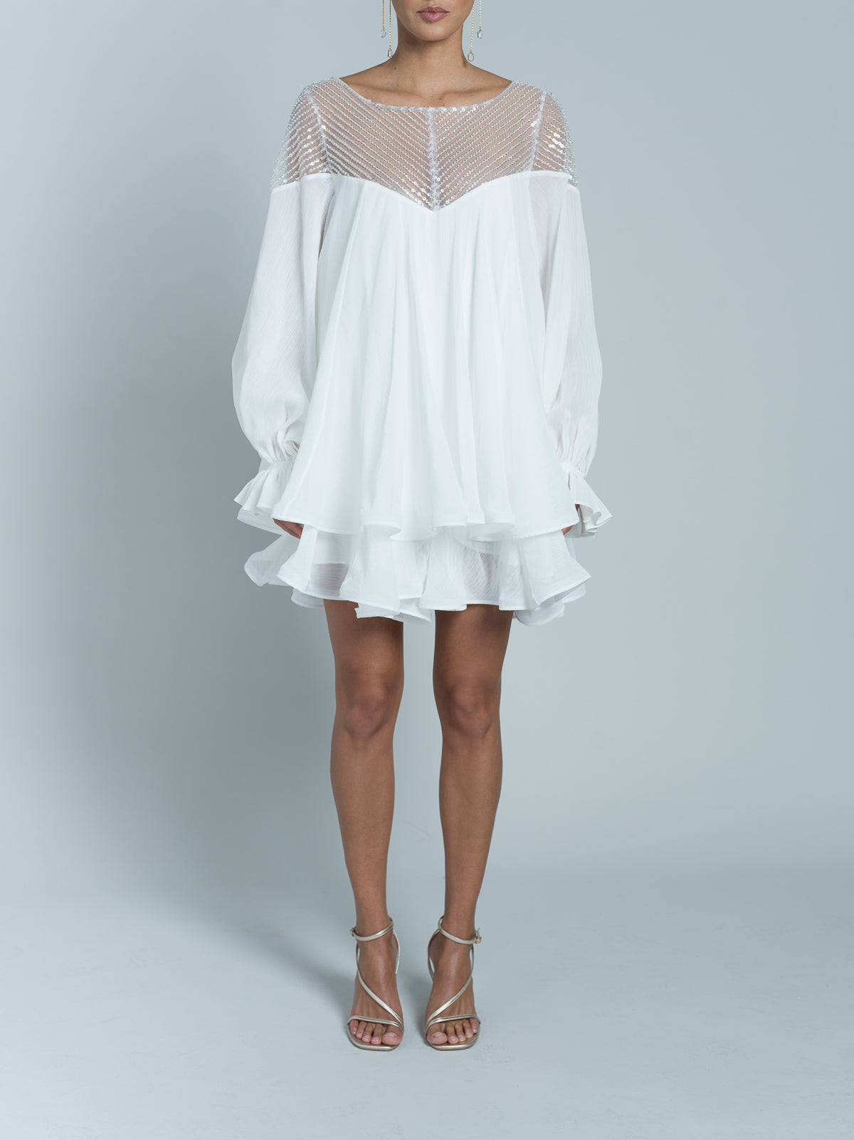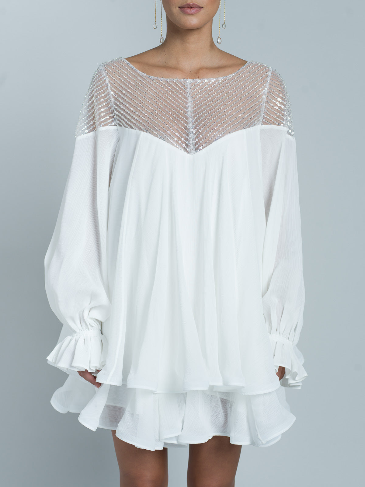 Robe courte à manches longues entièrement réalisée en mousseline. Encolure en forme de cœur, agrémentée d'un tulle brodé de paillettes scintillantes et de perles transparentes. Manches fluides avec élastiques aux poignets. Des bandes de crin sont placées au bord des volants de la jupe pour donner de la structure et un effet ondulé.