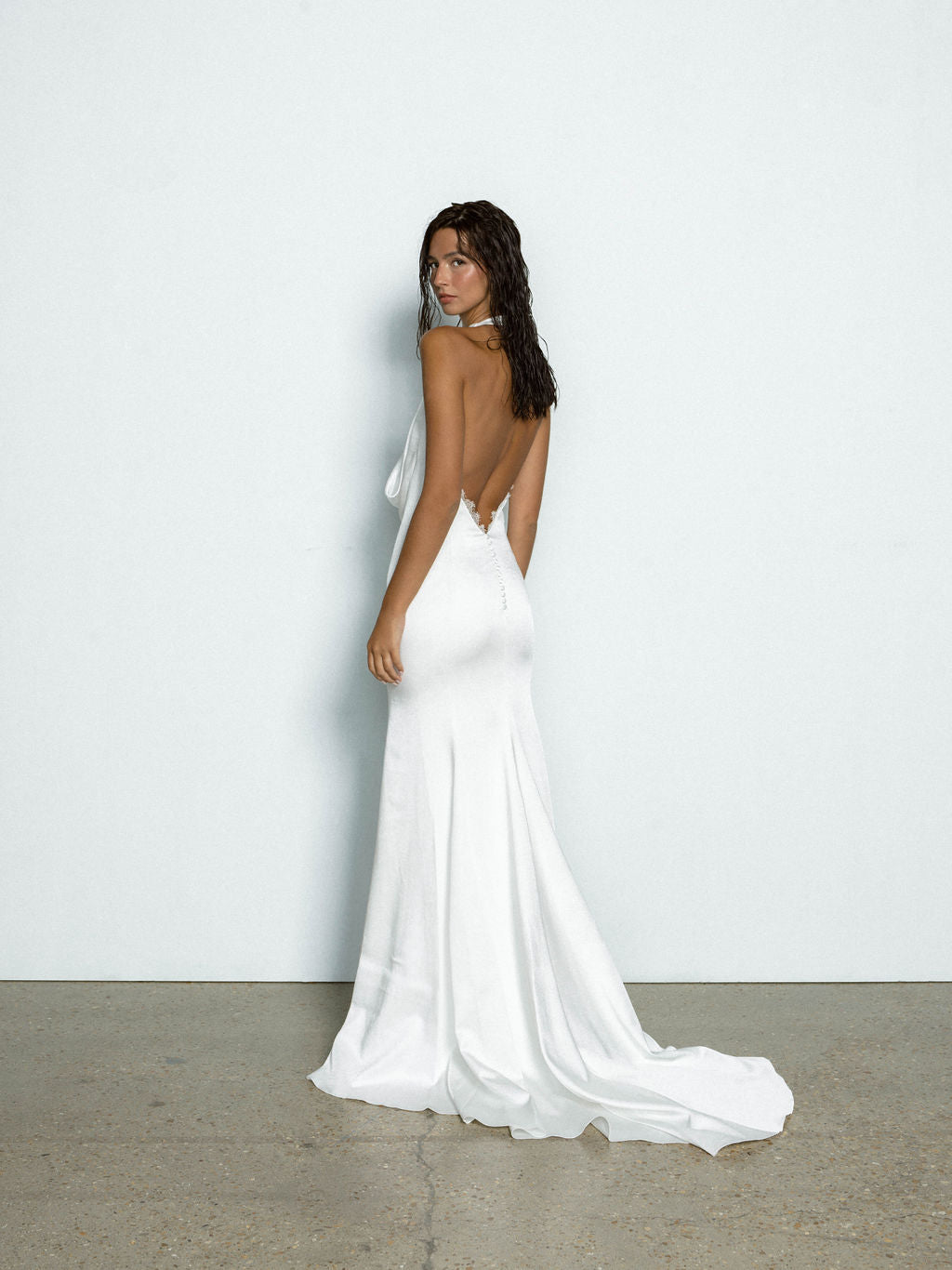 Robe halter en crêpe satin fluide et irisé, avec deux boutons pour la fermer au niveau du cou. Elle présente une jupe sirène, une traîne et un décolleté en V recouvert d’un col bénitier en soie charmeuse.