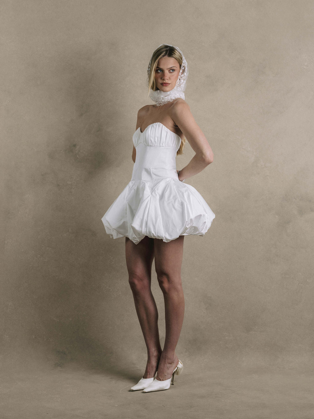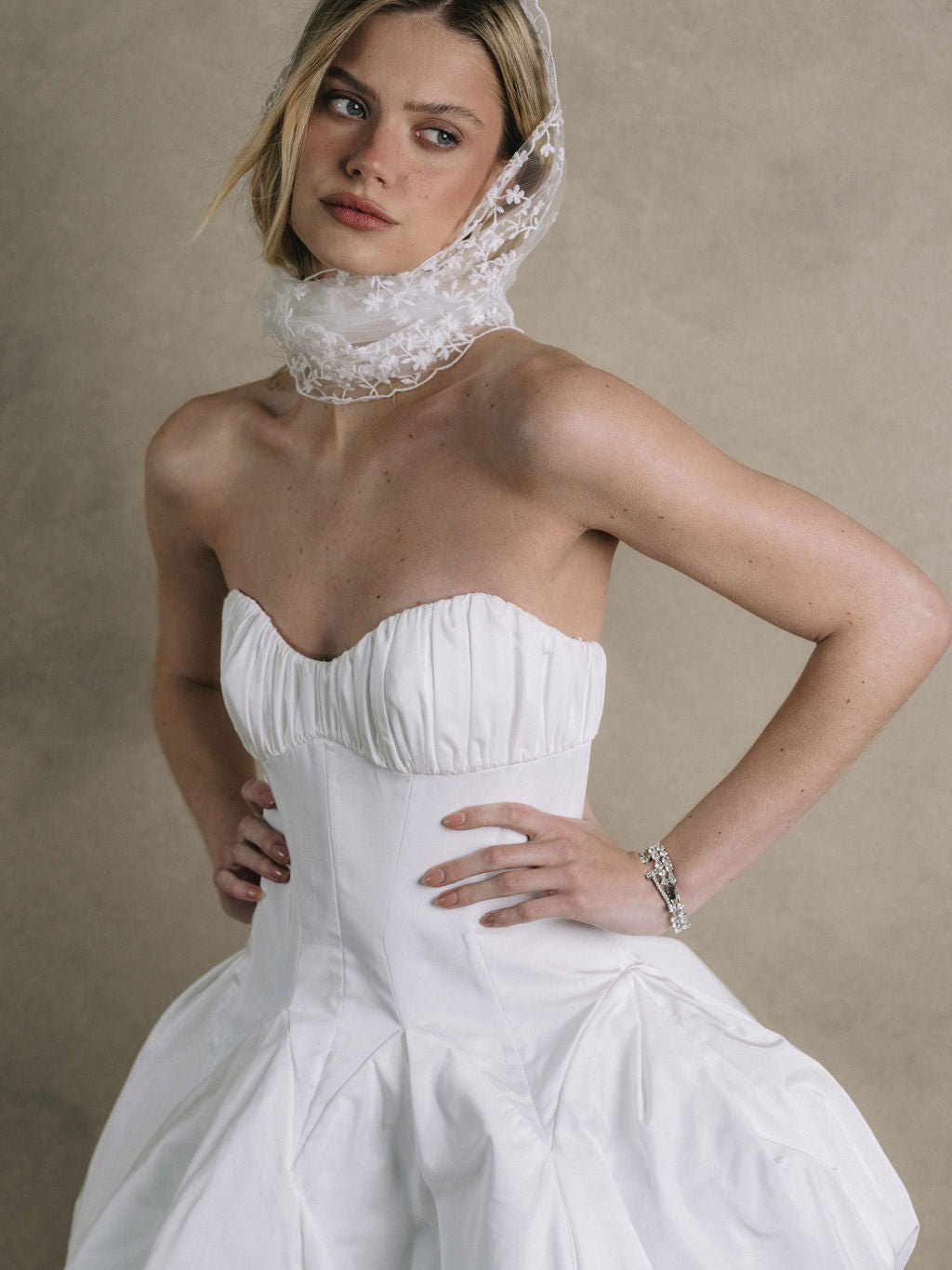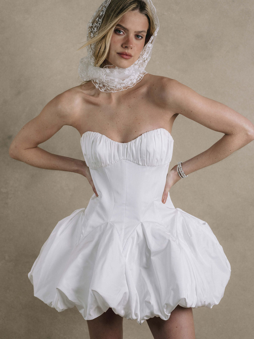 Robe courte bustier en Radzimir, présentant un effet bandeau froncé à l’avant pour une touche d’élégance. Le corset, renforcé par un tissu gainant intégré et des baleines, assure un maintien parfait et un ajustement optimal. La jupe ballon froncée, agrémentée de découpes nettes et précises, apporte volume et caractère à la silhouette, alliant modernité et sophistication.