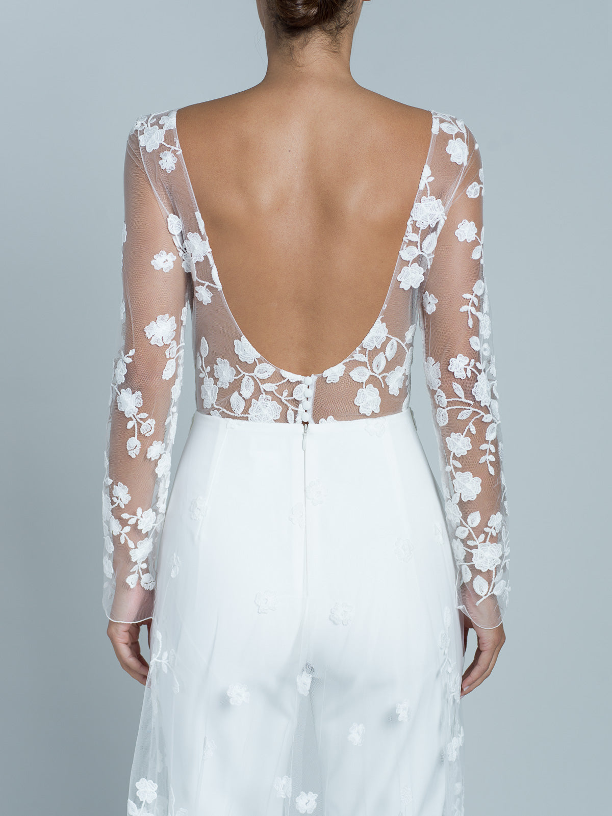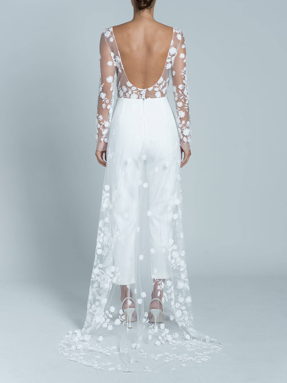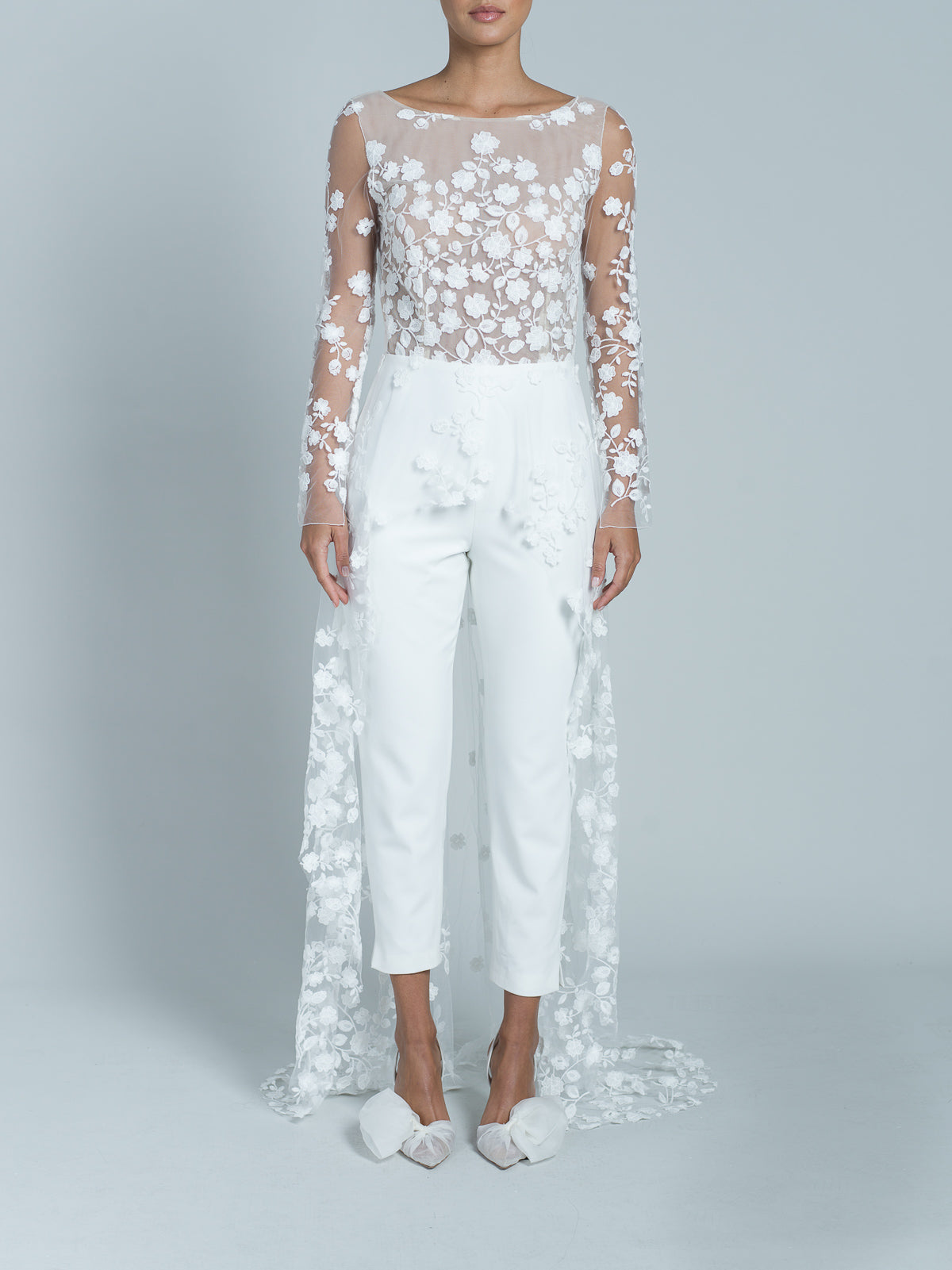 Combinaison à manches longues et pantalon droit en crêpe cady. Le haut est entièrement réalisé en dentelle florale brodée, avec une doublure en tulle nude. Encolure bateau. Traîne entièrement en dentelle florale brodée en dégradé vers le sol. Dos ouvert en forme de U et détails en dentelle florale brodée avec 4 boutons en crêpe cady.