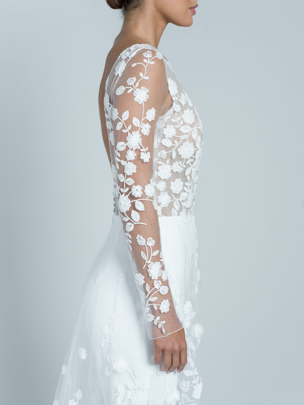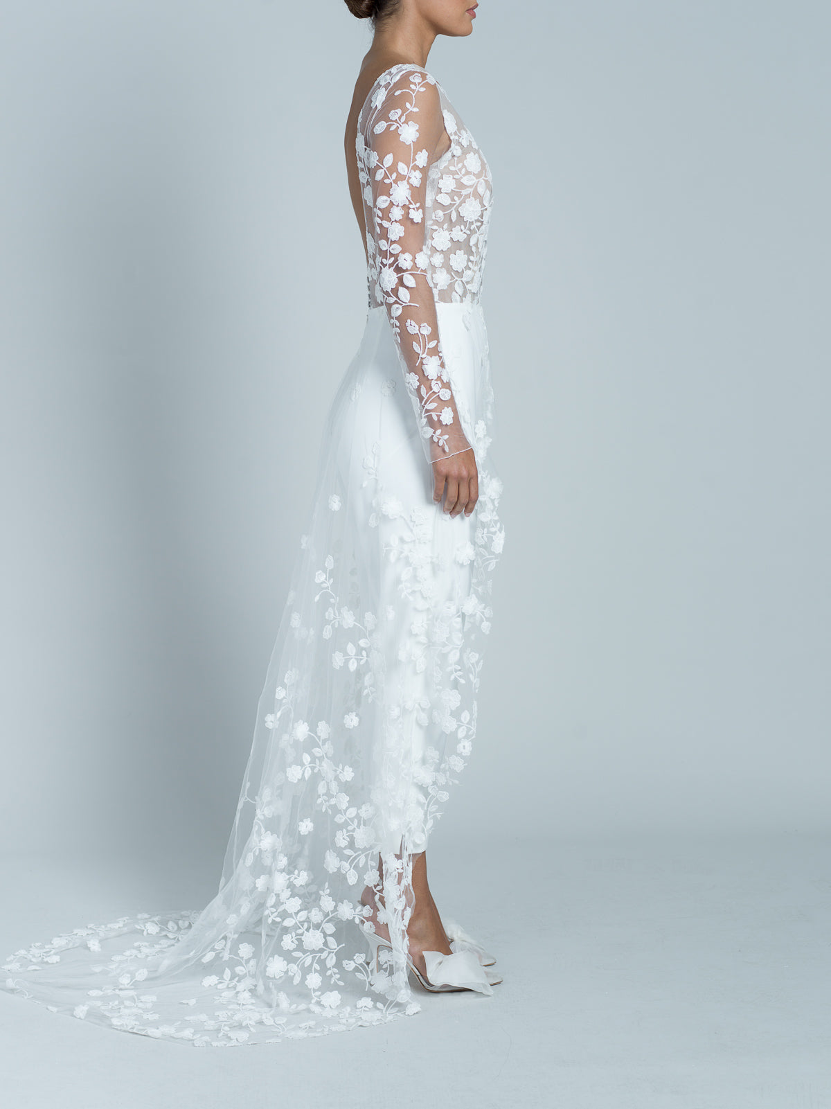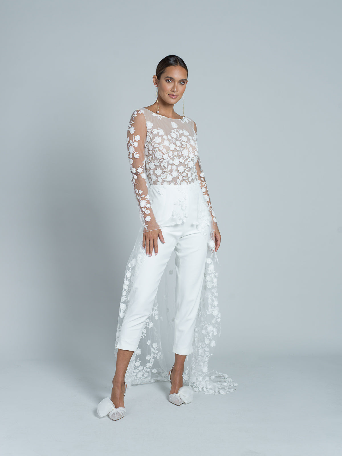 Combinaison à manches longues et pantalon droit en crêpe cady. Le haut est entièrement réalisé en dentelle florale brodée, avec une doublure en tulle nude. Encolure bateau. Traîne entièrement en dentelle florale brodée en dégradé vers le sol. Dos ouvert en forme de U et détails en dentelle florale brodée avec 4 boutons en crêpe cady.