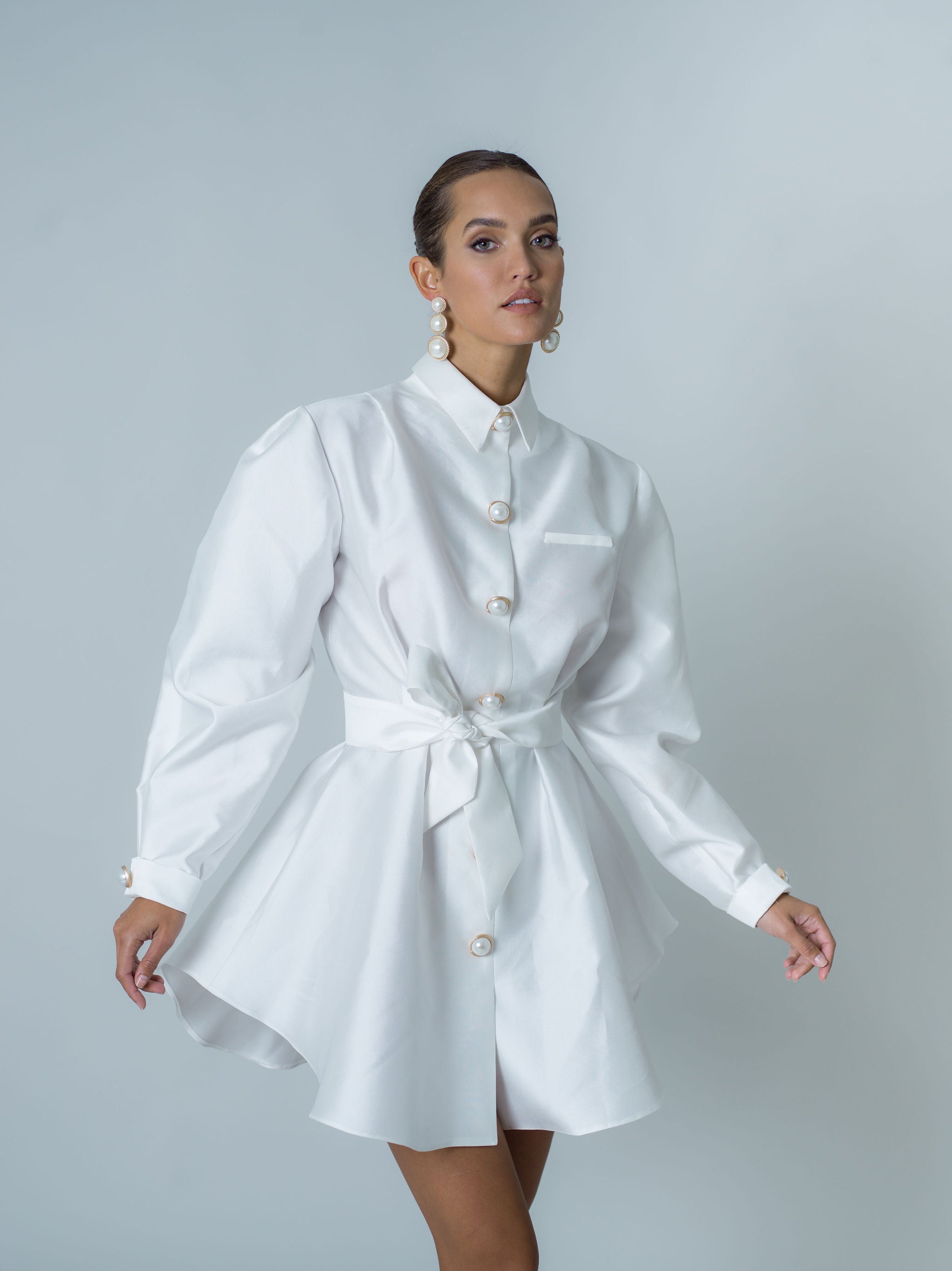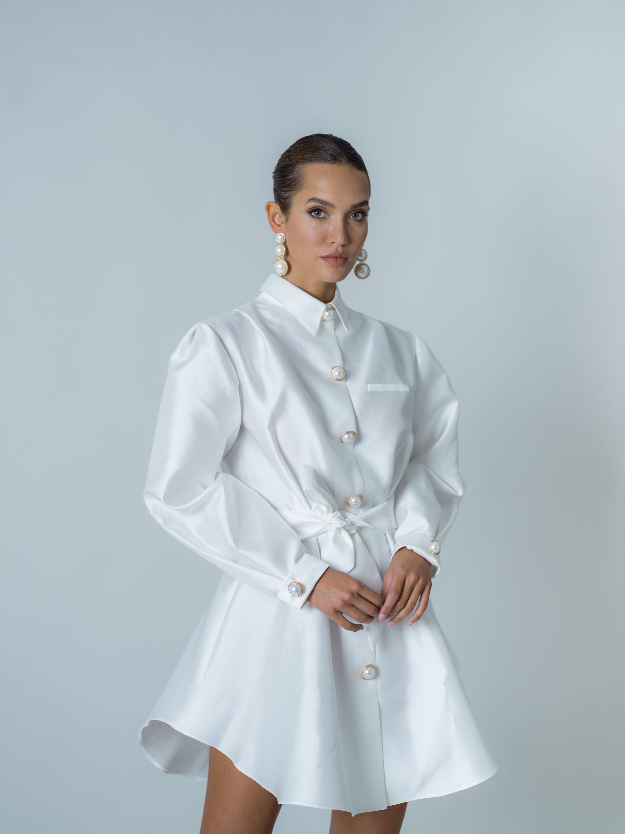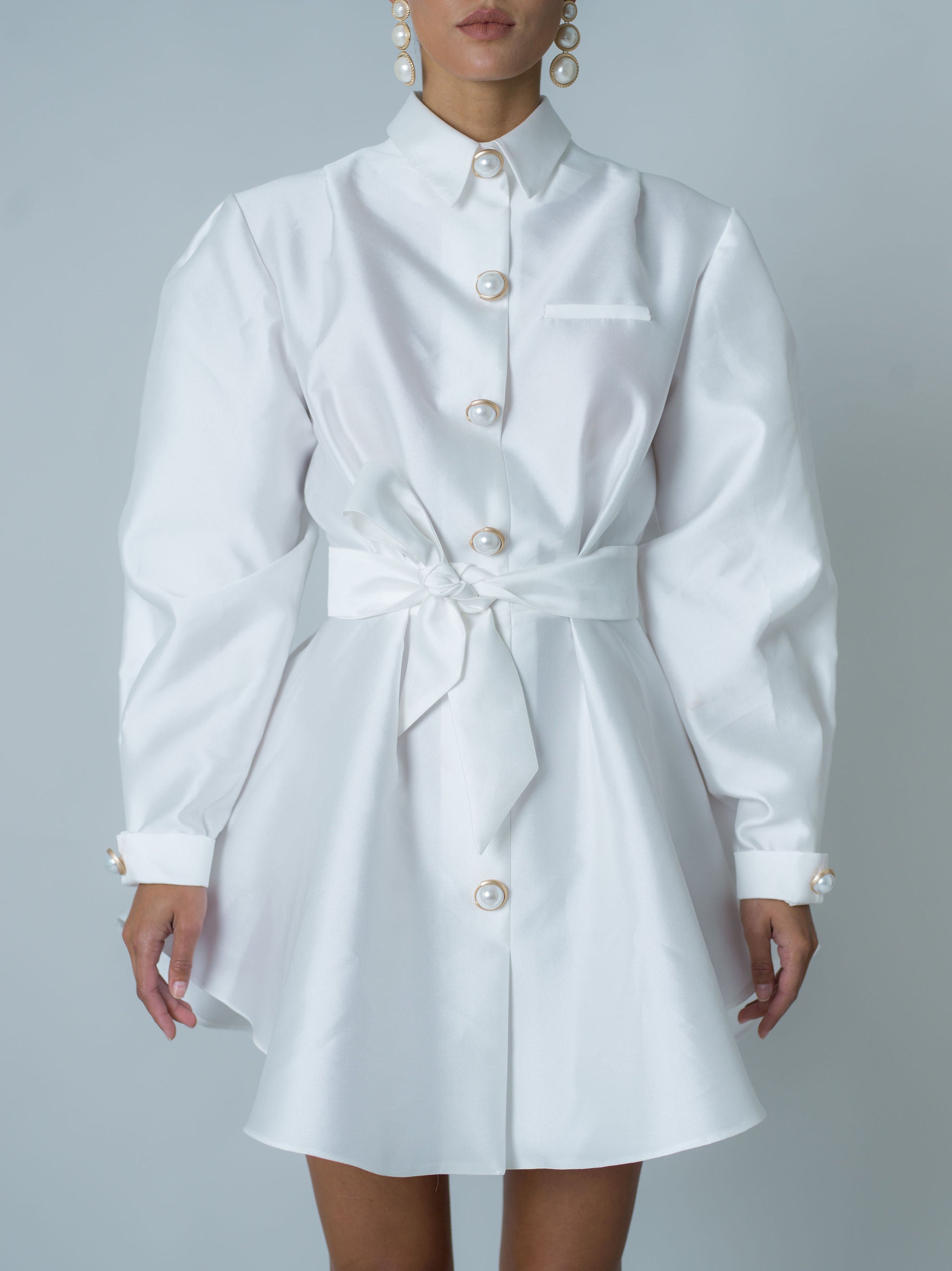 Robe-chemise courte entièrement réalisée en mikado, un tissu qui donne de la structure tout en restant léger. Ceinture amovible assortie qui définit la silhouette. Boutons décoratifs dorés avec perles sur le devant et sur les poignets. Larges manches ajustées aux poignets.