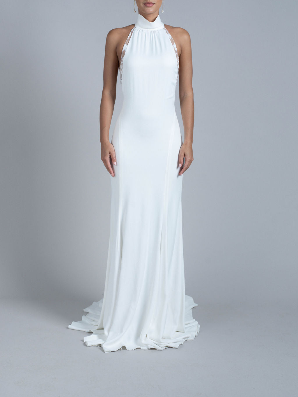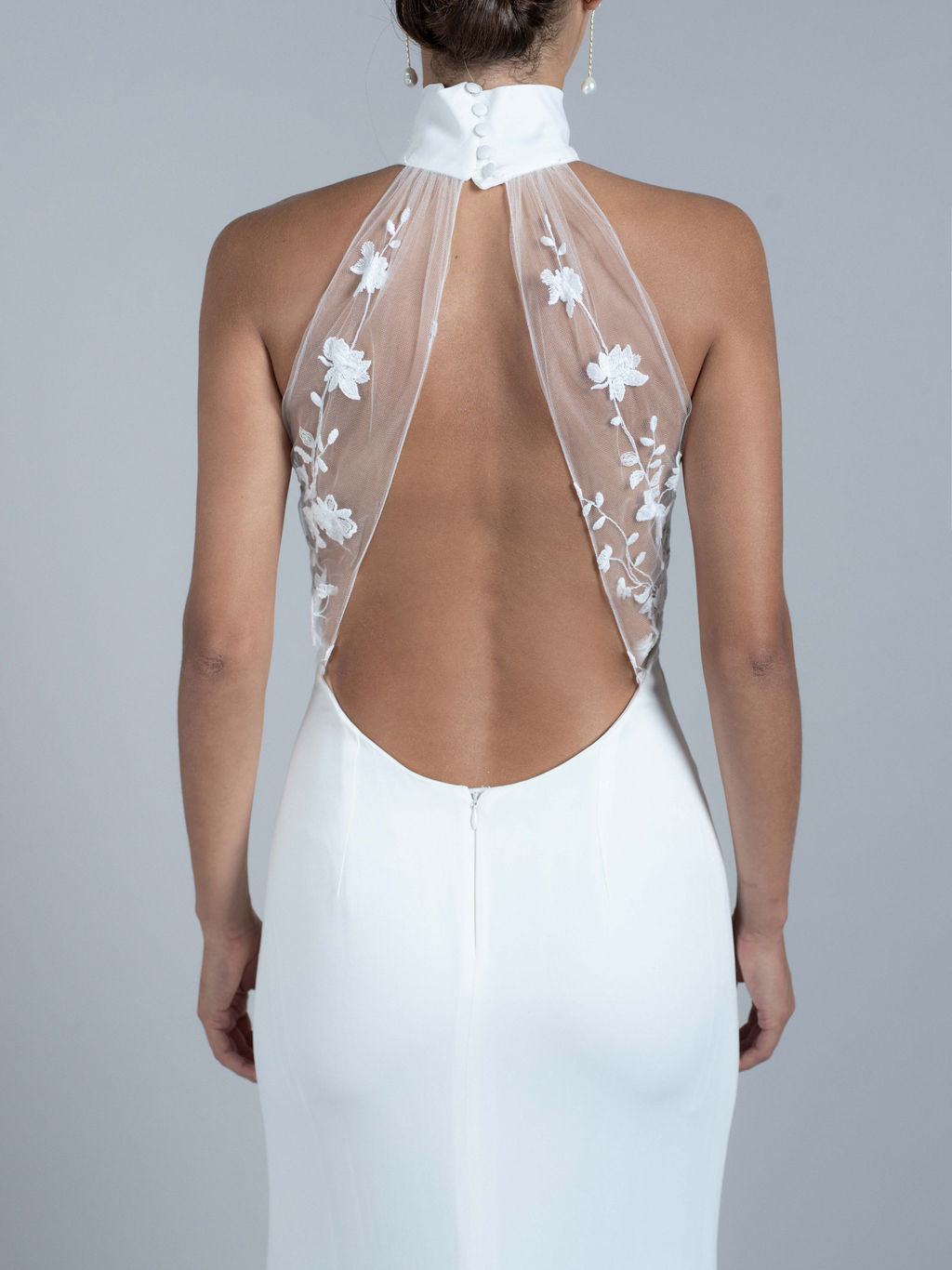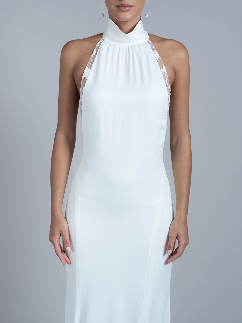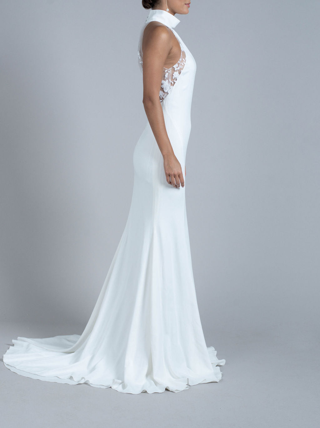 Robe en crêpe couture avec détails en dentelle florale allant des côtés jusqu’en haut du dos. Coupe près du corps sur le haut avant de s’évaser légèrement sous les hanches.