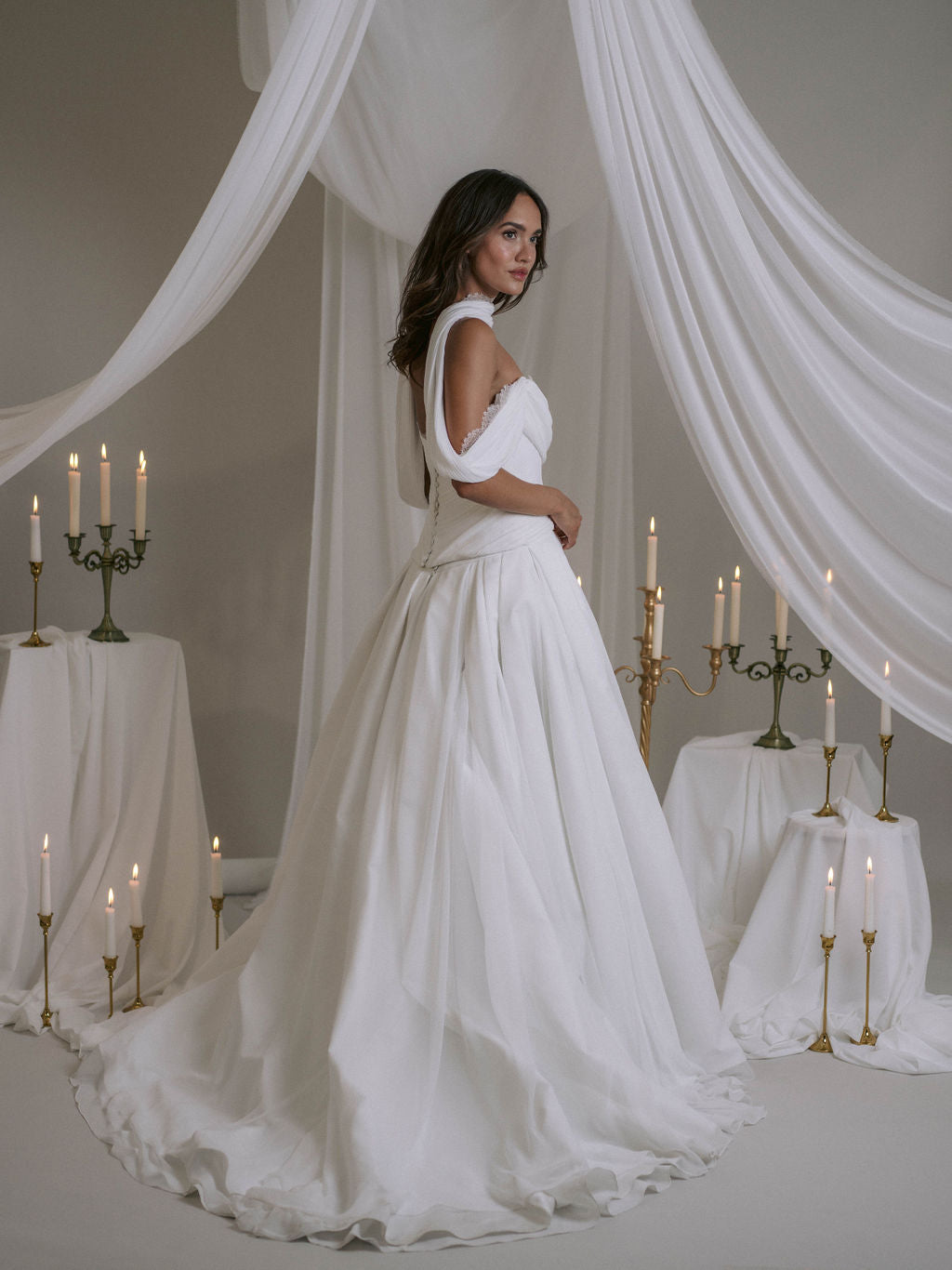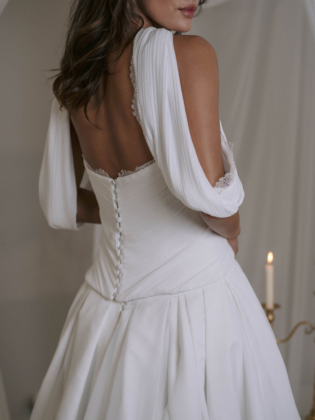 Le top bustier de la robe Reverie est confectionné dans un tissu plissé avec des découpes audacieuses qui s’étendent des côtés vers le centre devant. Il descend gracieusement dans le dos et épouse les courbes des hanches grâce à des baleines et une ceinture assurant maintien et structure. Un drapé plissé à l’avant du bustier apporte une touche de sophistication. La fermeture se compose de boutons décoratifs et d’agrafes pour un ajustement parfait