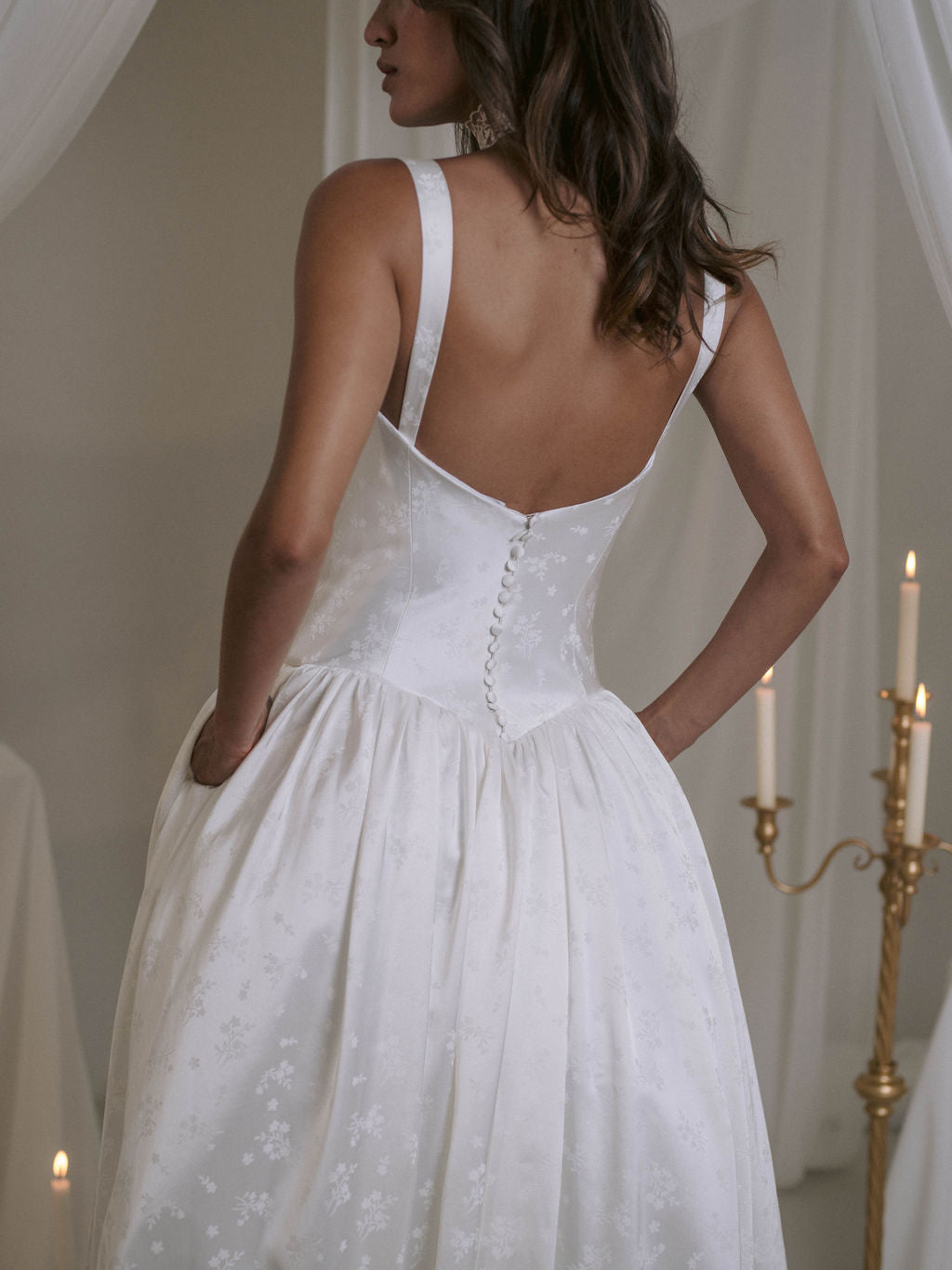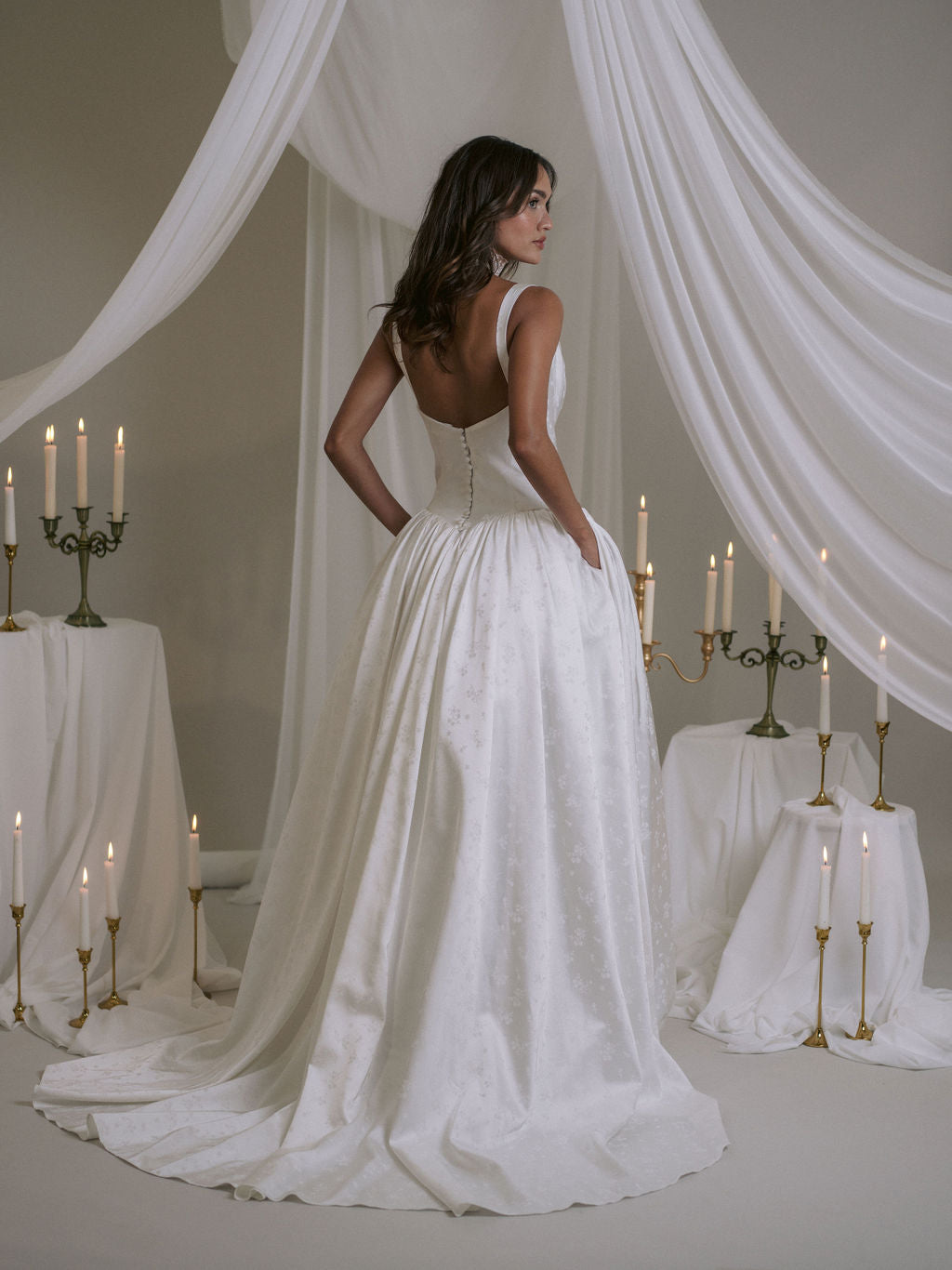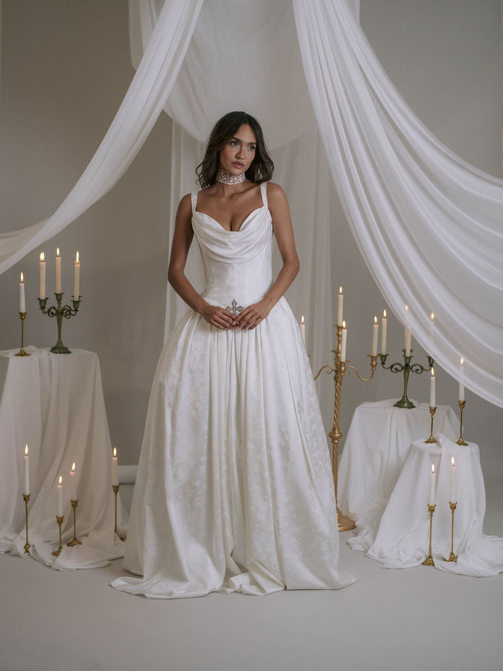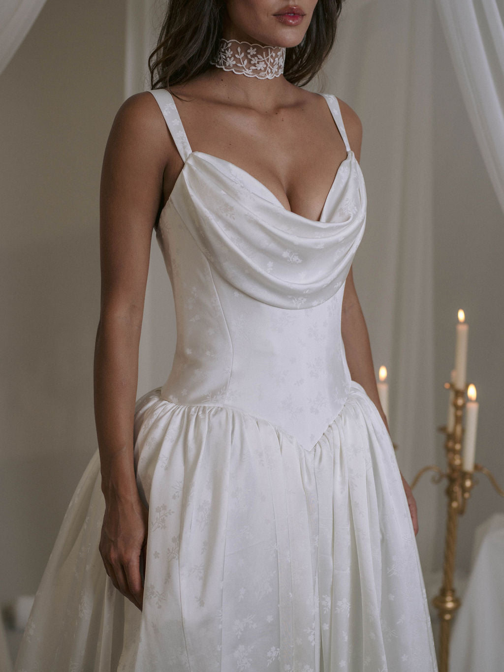 La robe Roslyn présente des lignes élégantes et modernes, disponible en satin duchesse ou en satin jacquard avec le motif « petit bouquet » développé par Rime en Italie. Le corset arbore un décolleté pointu à l’avant comme à l’arrière, mettant en valeur la silhouette. Le profond décolleté en V arrondi est orné d’un drapé façon bénitier, tandis que de larges bretelles assurent un maintien confortable et élégant