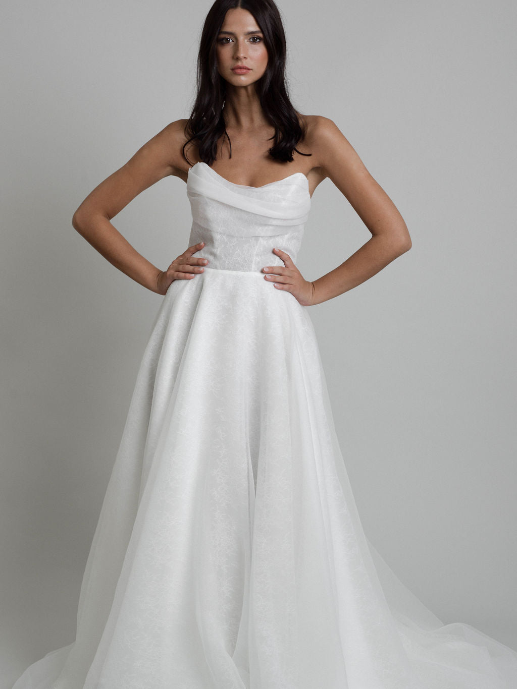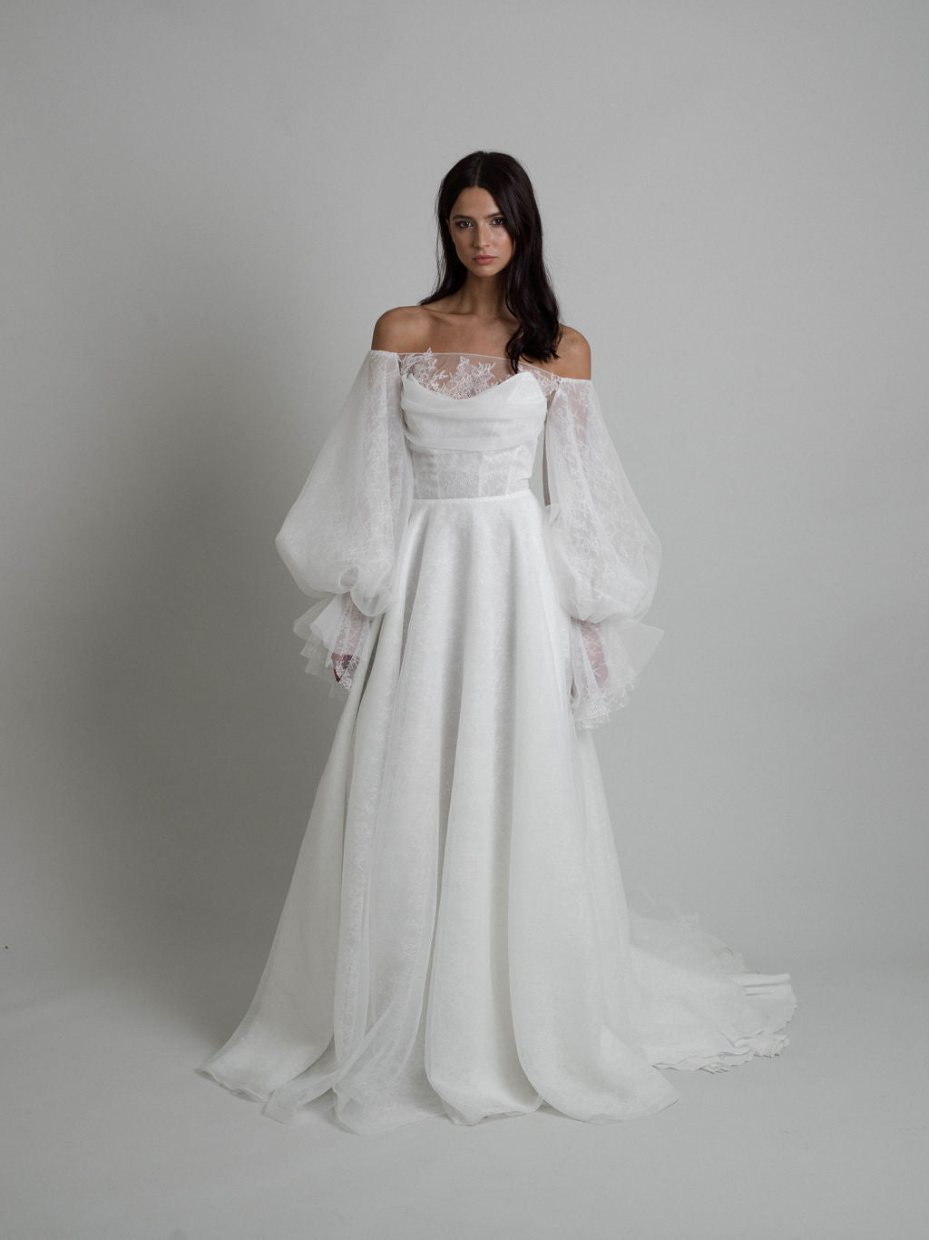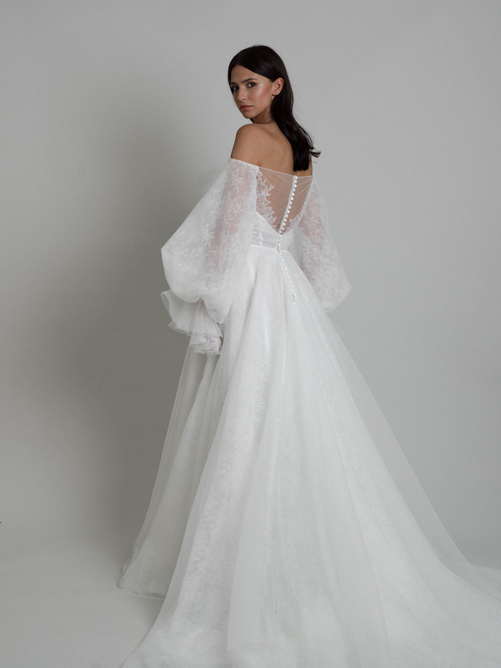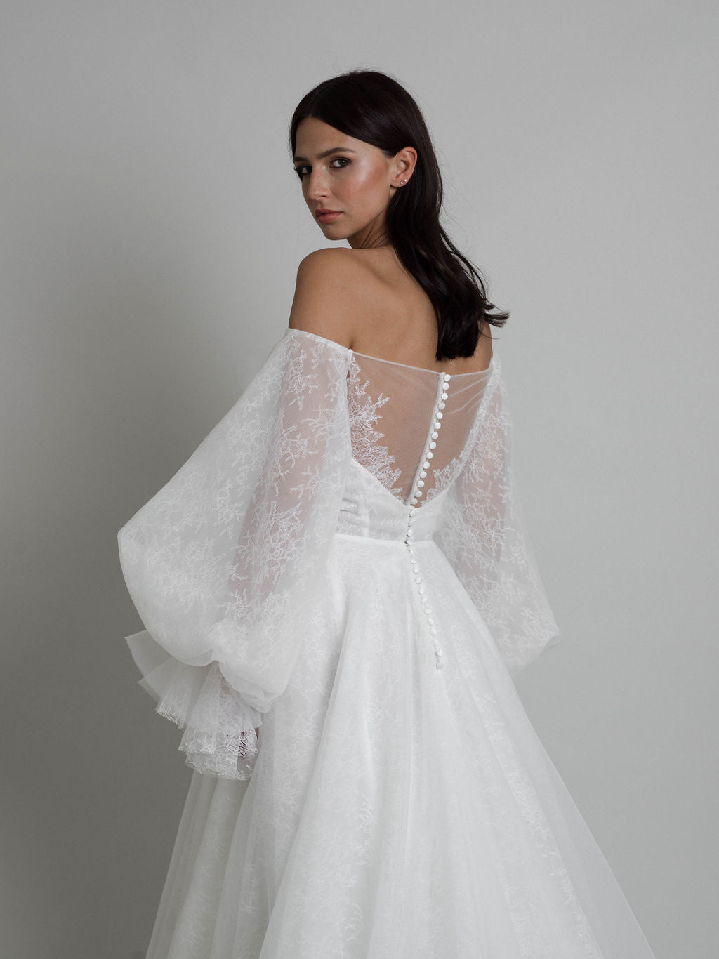 Elle présente un bustier en tulle multi-couches et dentelle de Chantilly Calais-Caudry, renforcé par des baleines jusqu’à la taille. Un drapé asymétrique en organza texturé au niveau de la poitrine crée de subtiles nuances de transparence. L’ensemble comprend des manches ballon amovibles en dentelle Chantilly, resserrées aux poignets et ornées d’un volant en organza texturé tombant délicatement sur la main. Des motifs floraux en dentelle Chantilly, disposés de manière aléatoire, décorent les manches.