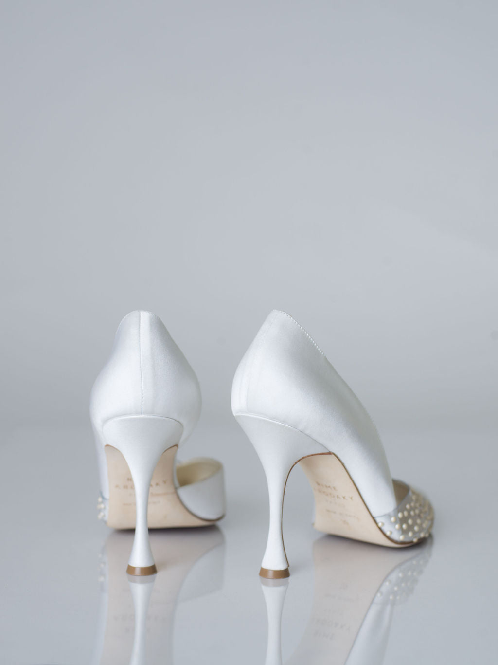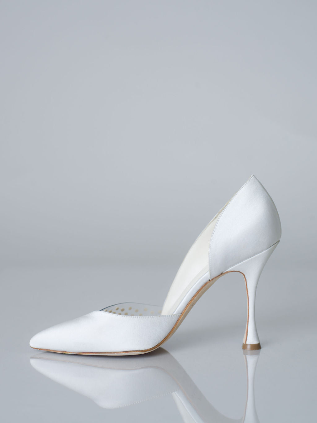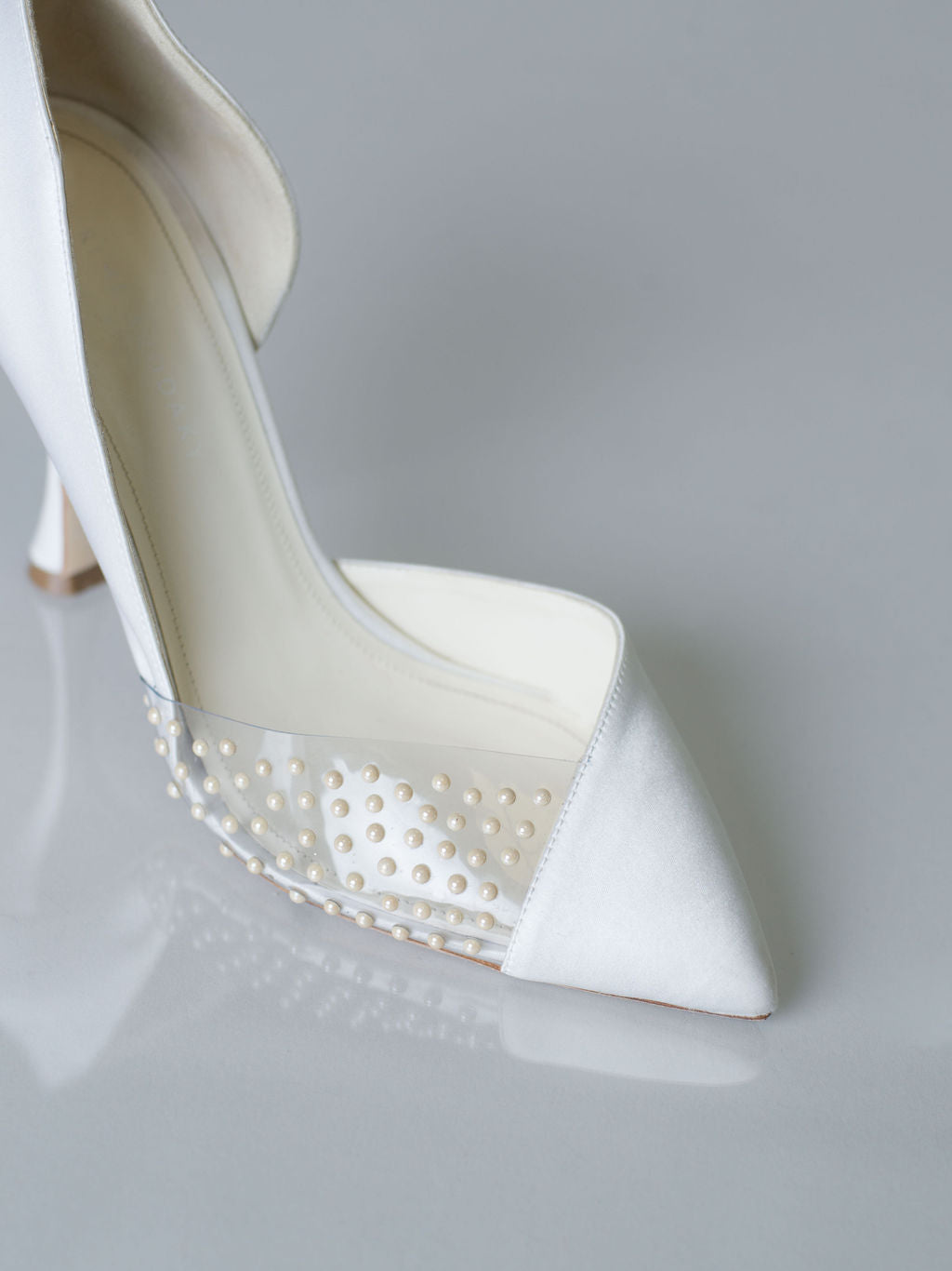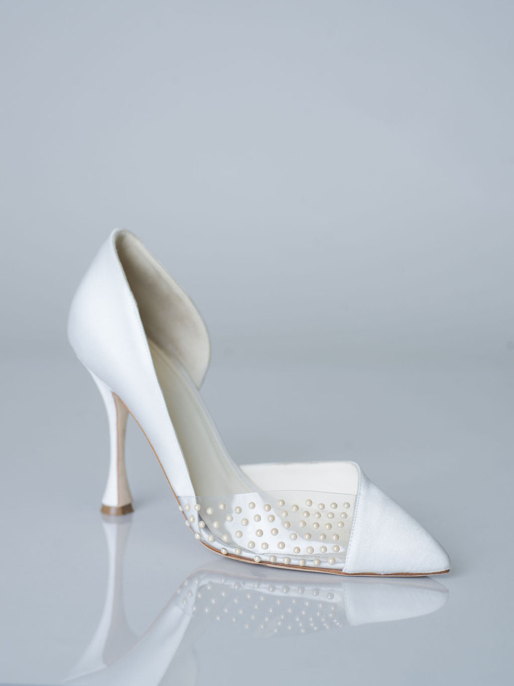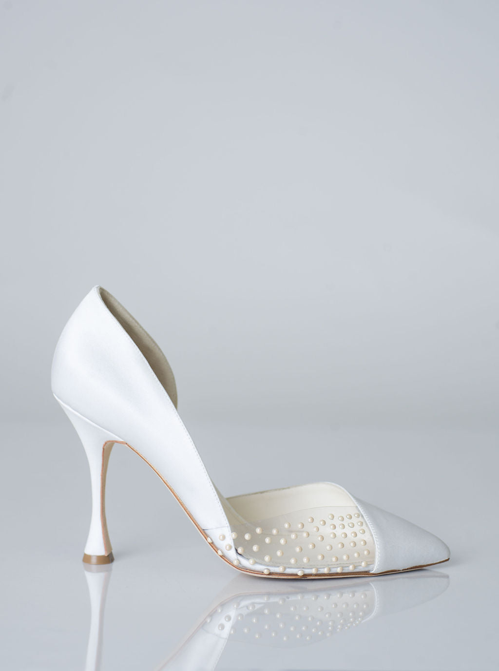 Les escarpins Sonia sont d'une élégance pure. Confectionnés en Italie dans un satin soyeux, ils sont ornés d'une découpe transparente et d'une délicate demi-perle appliquée.