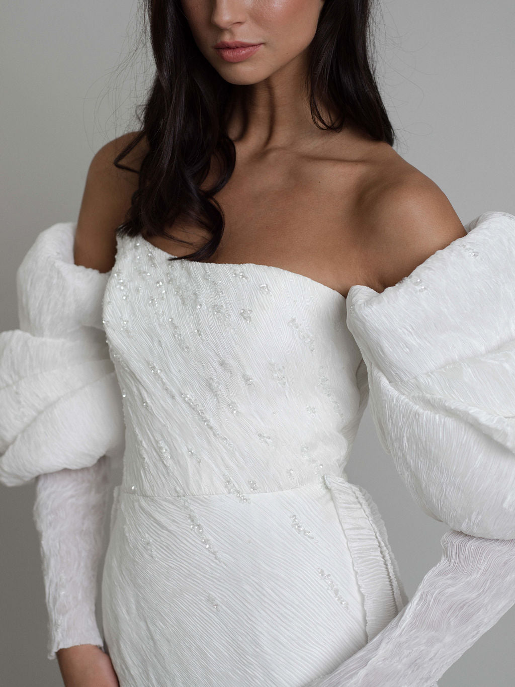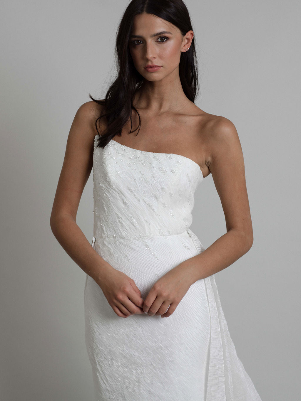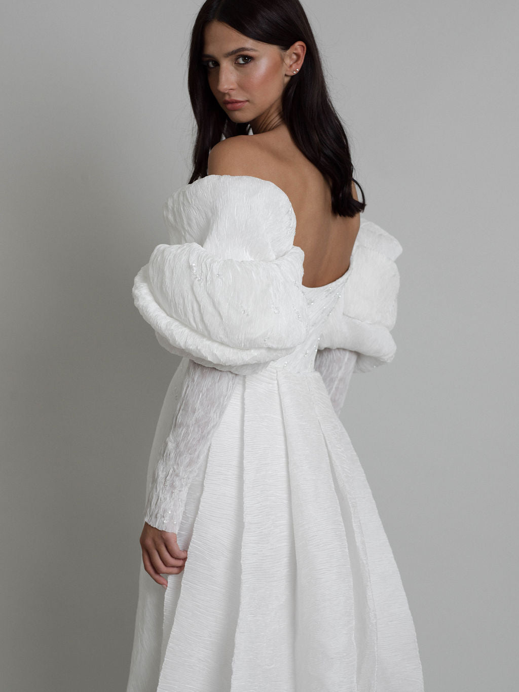 La robe Talisman présente une silhouette contemporaine sublimée par des cristaux qui dessinent un parcours céleste. Son tissu innovant, aux plis serrés, allie opacité et finition satinée, capturant avec grâce les jeux de lumière.