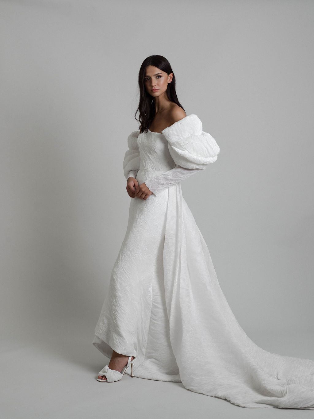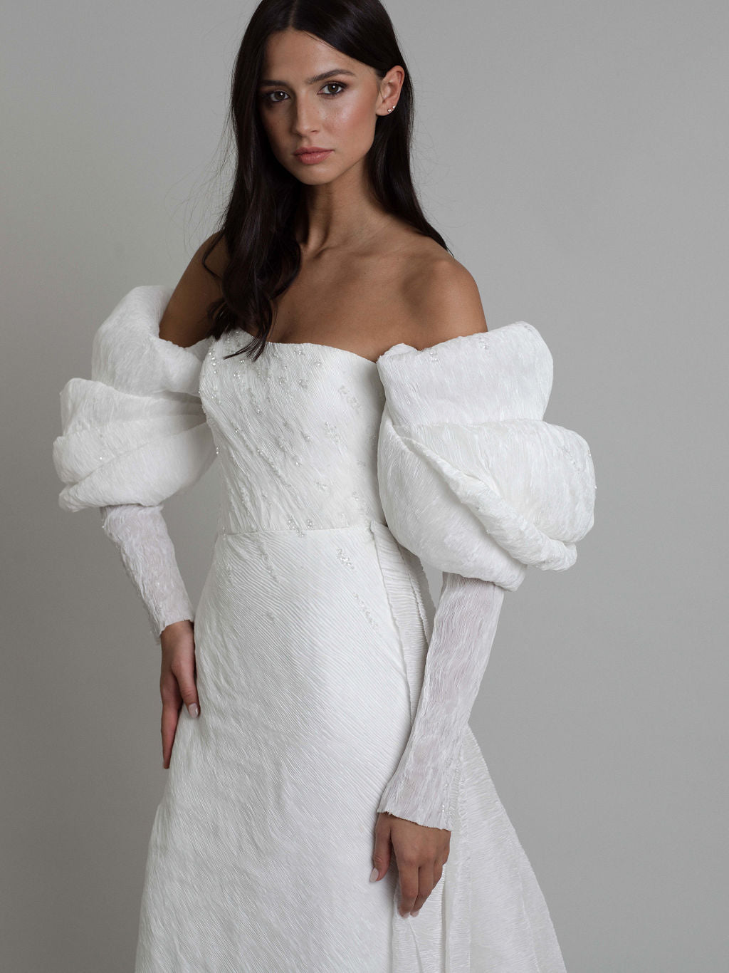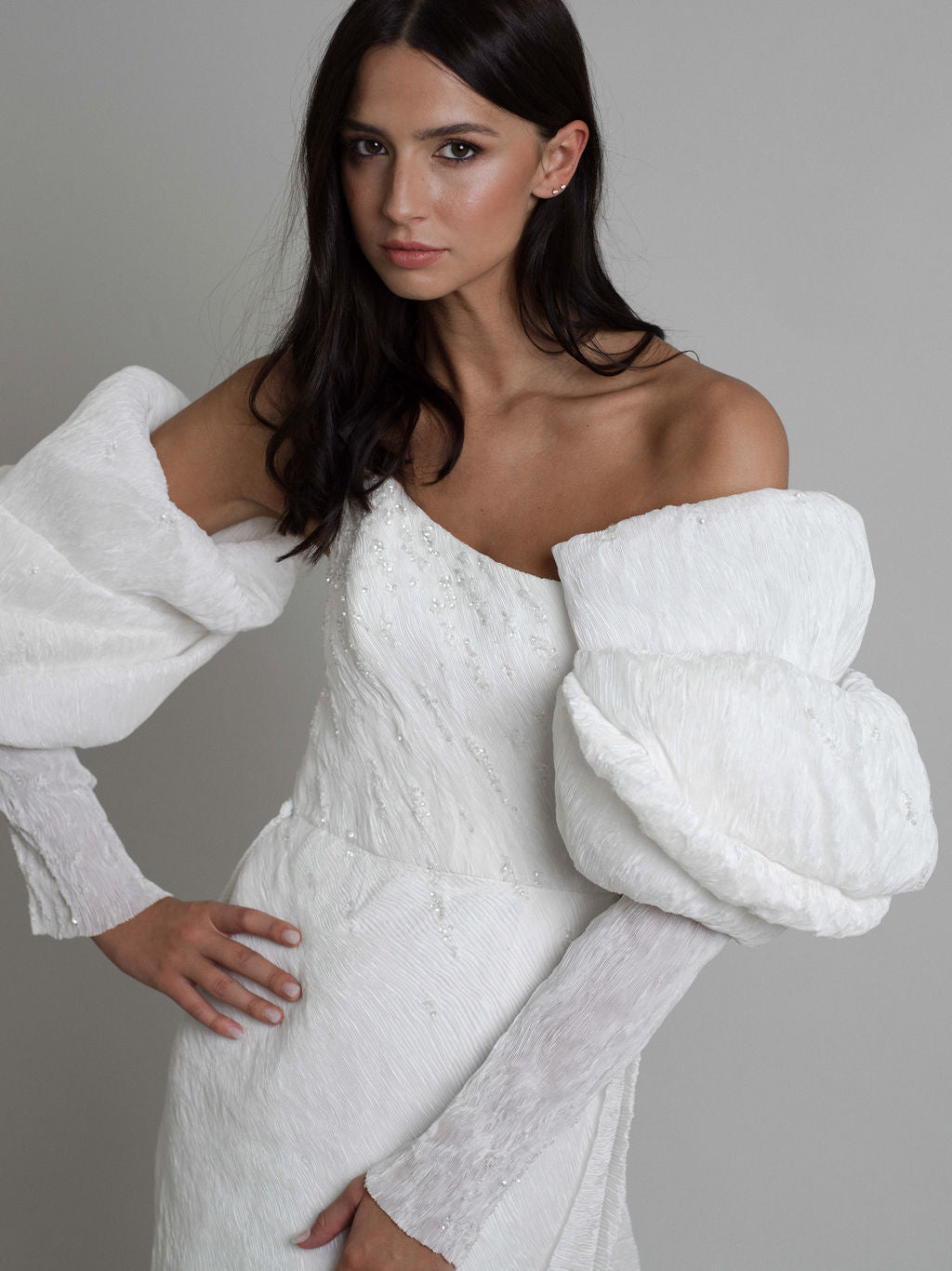 La robe Talisman présente une silhouette contemporaine sublimée par des cristaux qui dessinent un parcours céleste. Son tissu innovant, aux plis serrés, allie opacité et finition satinée, capturant avec grâce les jeux de lumière.