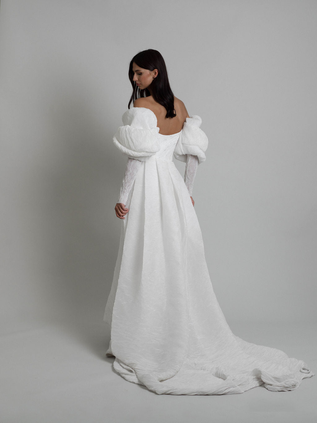 Plus de 50 mètres de tissu sont minutieusement utilisés pour donner vie à la robe Talisman. La réalisation de la broderie complexe, mêlant perles givrés, brillantes et transparentes qui ornent élégamment la pièce, demande 35 heures de travail.