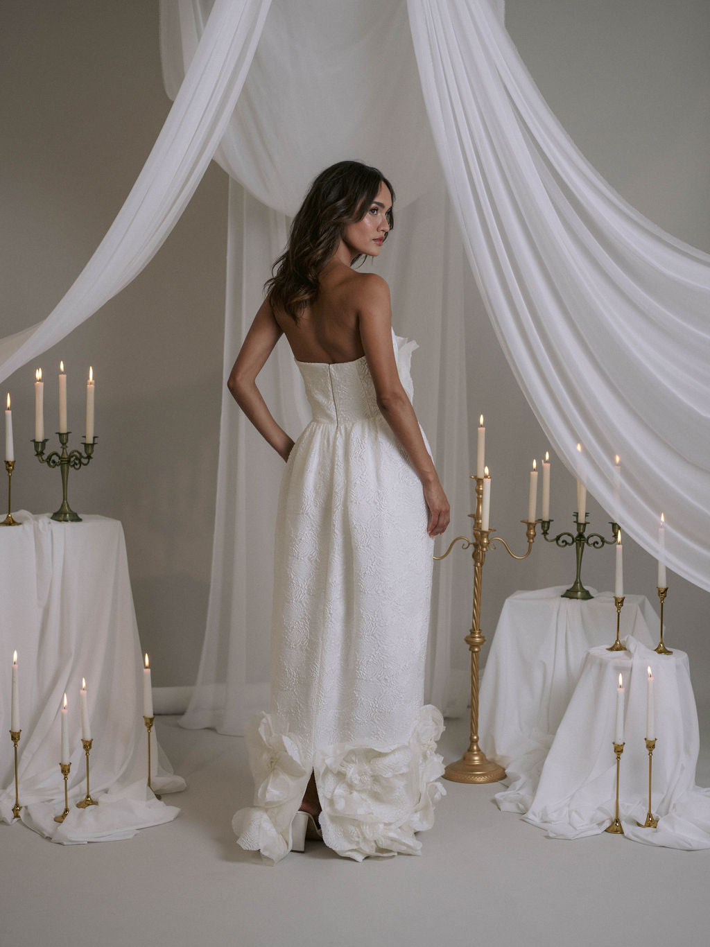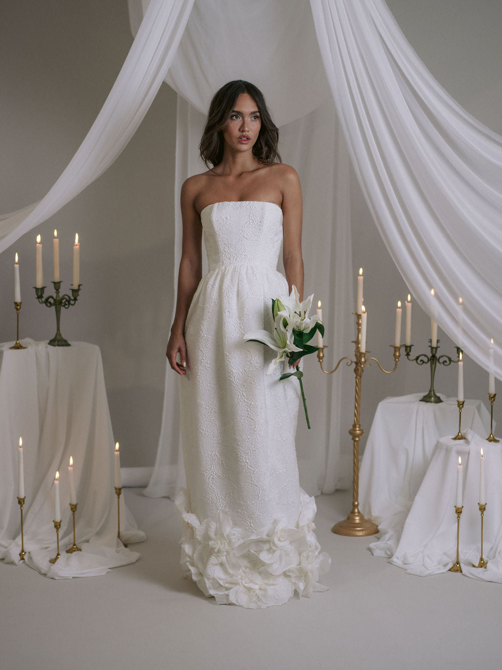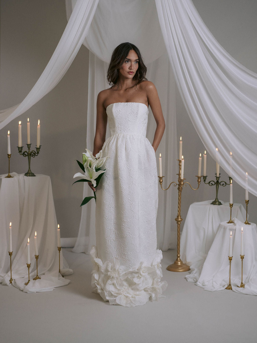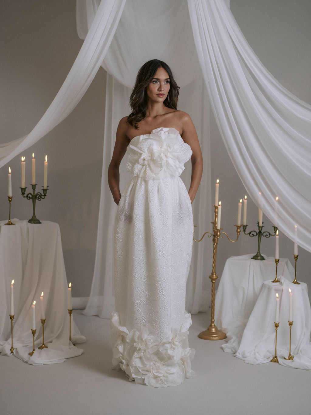 La robe bustier "Violet" est structurée par des baleines et une ceinture jusqu’à la taille, confectionnée dans un tissu embossé au motif camélia. Elle se ferme discrètement au dos par un zip. La jupe boule, froncée à la taille, comporte des poches latérales. Sous l’embossage, le crêpe couture garantit à la fois opacité et tenue.