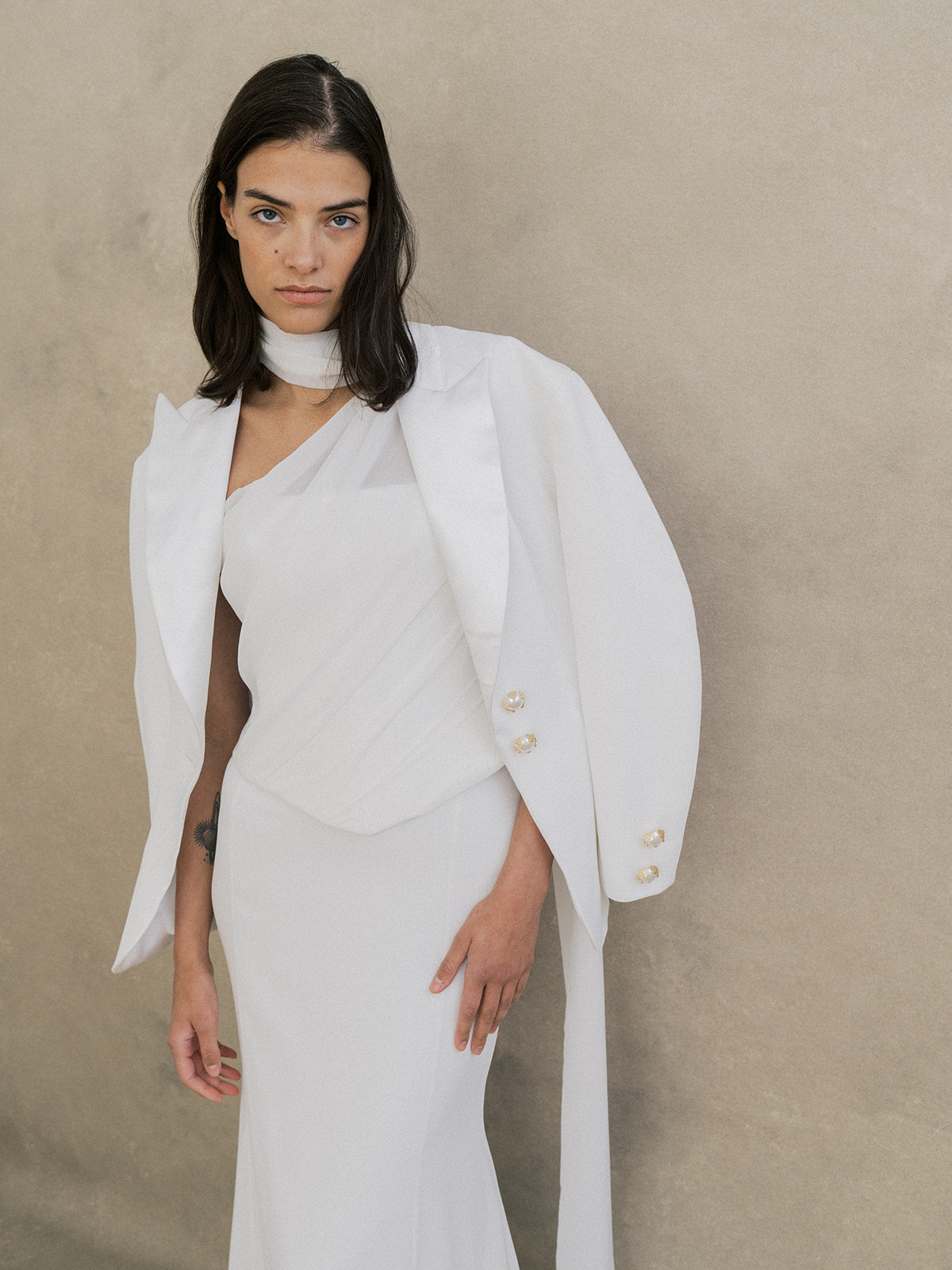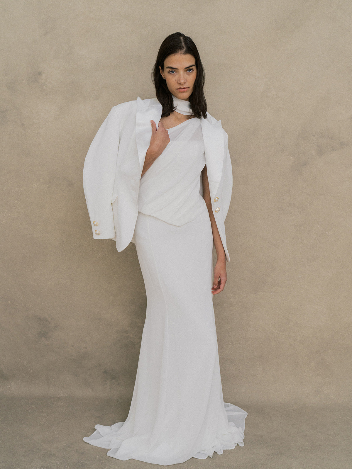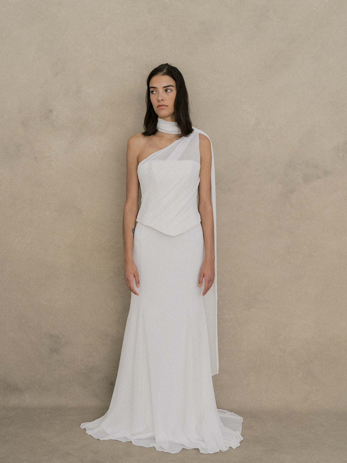 Jupe longue en crêpe et chiffon, avec une silhouette légèrement évasée inspirée de la coupe sirène. De délicates découpes latérales apportent un subtil détail, tandis qu’une fine ceinture souligne la taille. Fermeture zippée au centre du dos, sans traîne, pour un look fluide, féminin et moderne.