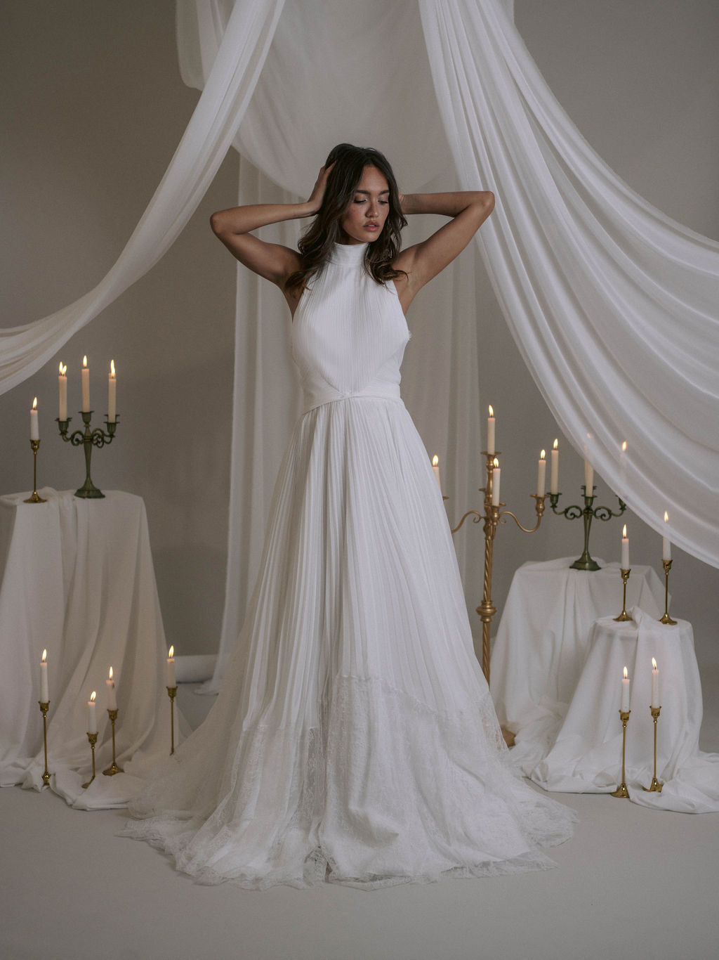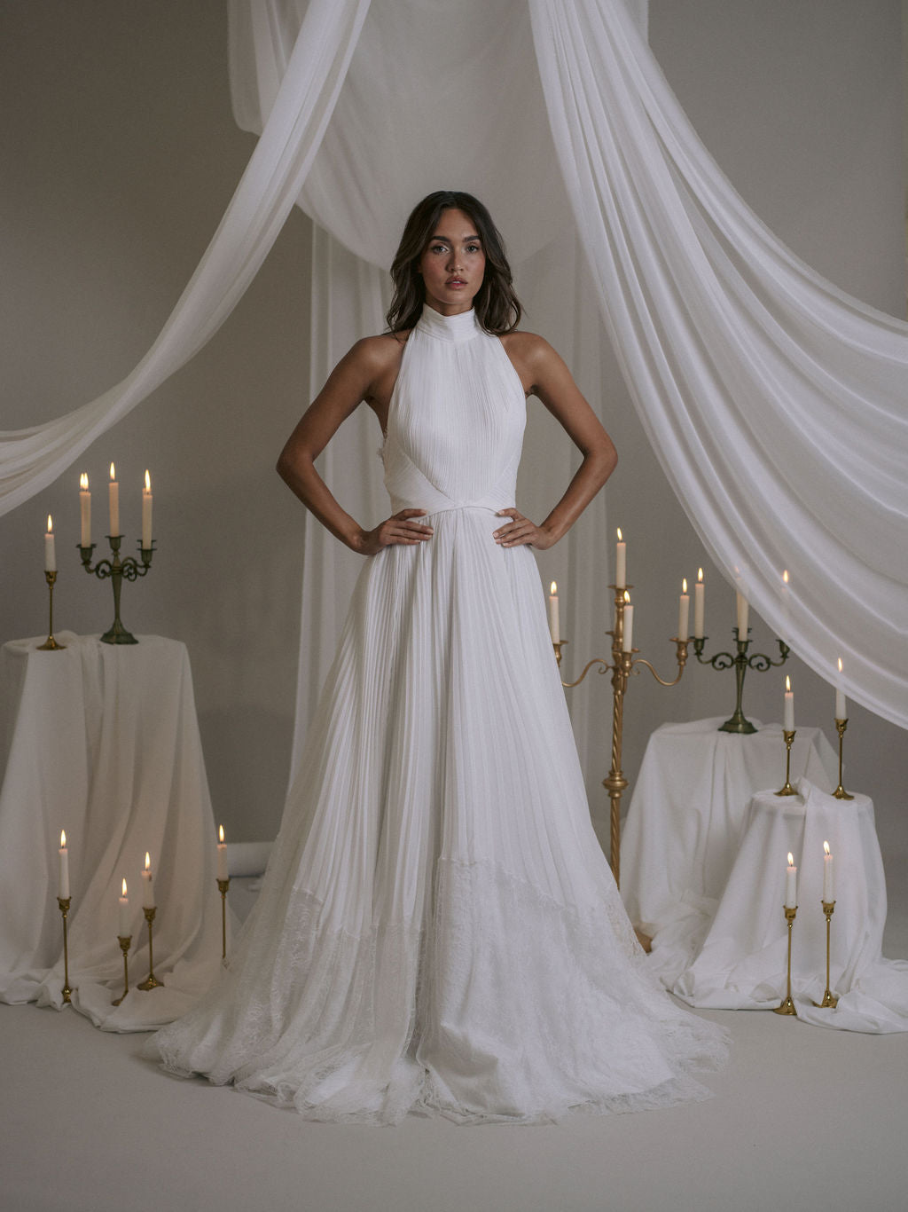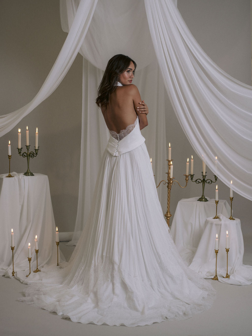 Le haut de la robe Whisper présente un col halter avec un col montant en chiffon plissé. Des découpes graphiques longent les côtés, tandis qu’un profond décolleté en V orné de dentelle de Calais sublime le dos. La fermeture se fait par brides et boutons.